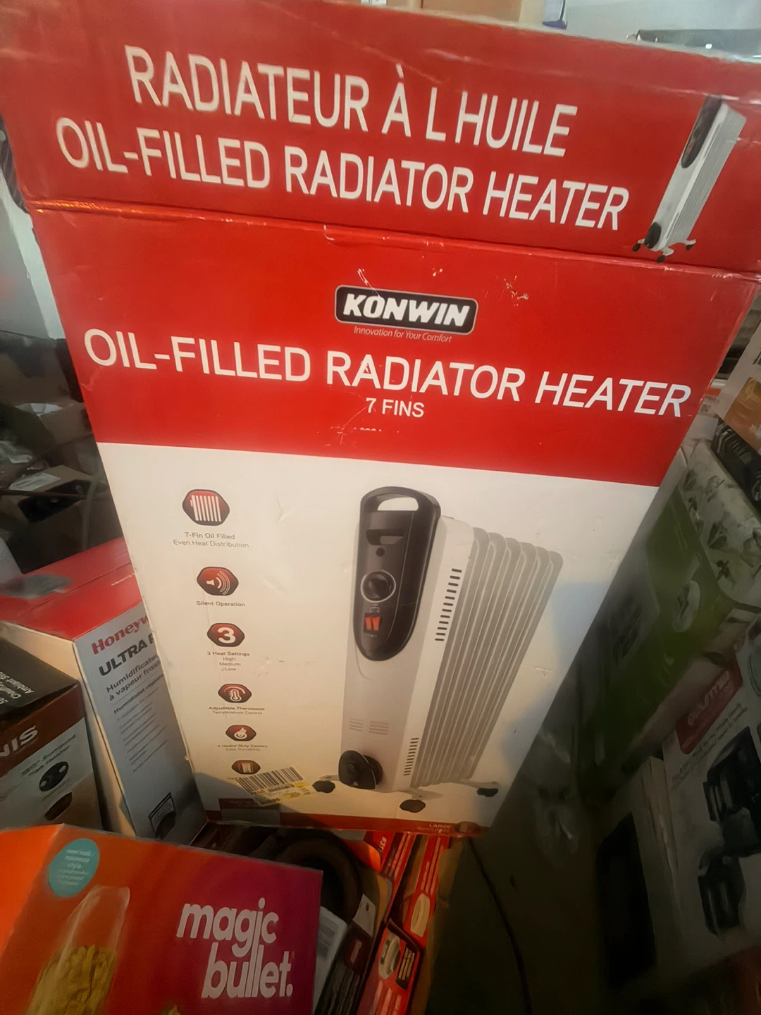 This Konwin oil-filled radiator heater has 7 fins for even heat distribution. It's designed for silent operation and features 3 heat settings with adjustable thermostat control. A great way to add supplementary heat to any room!