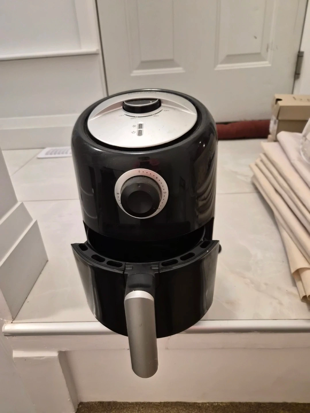This is a black air fryer with adjustable temperature and timer controls. It has a removable basket for easy cleaning. Great for quick meals!