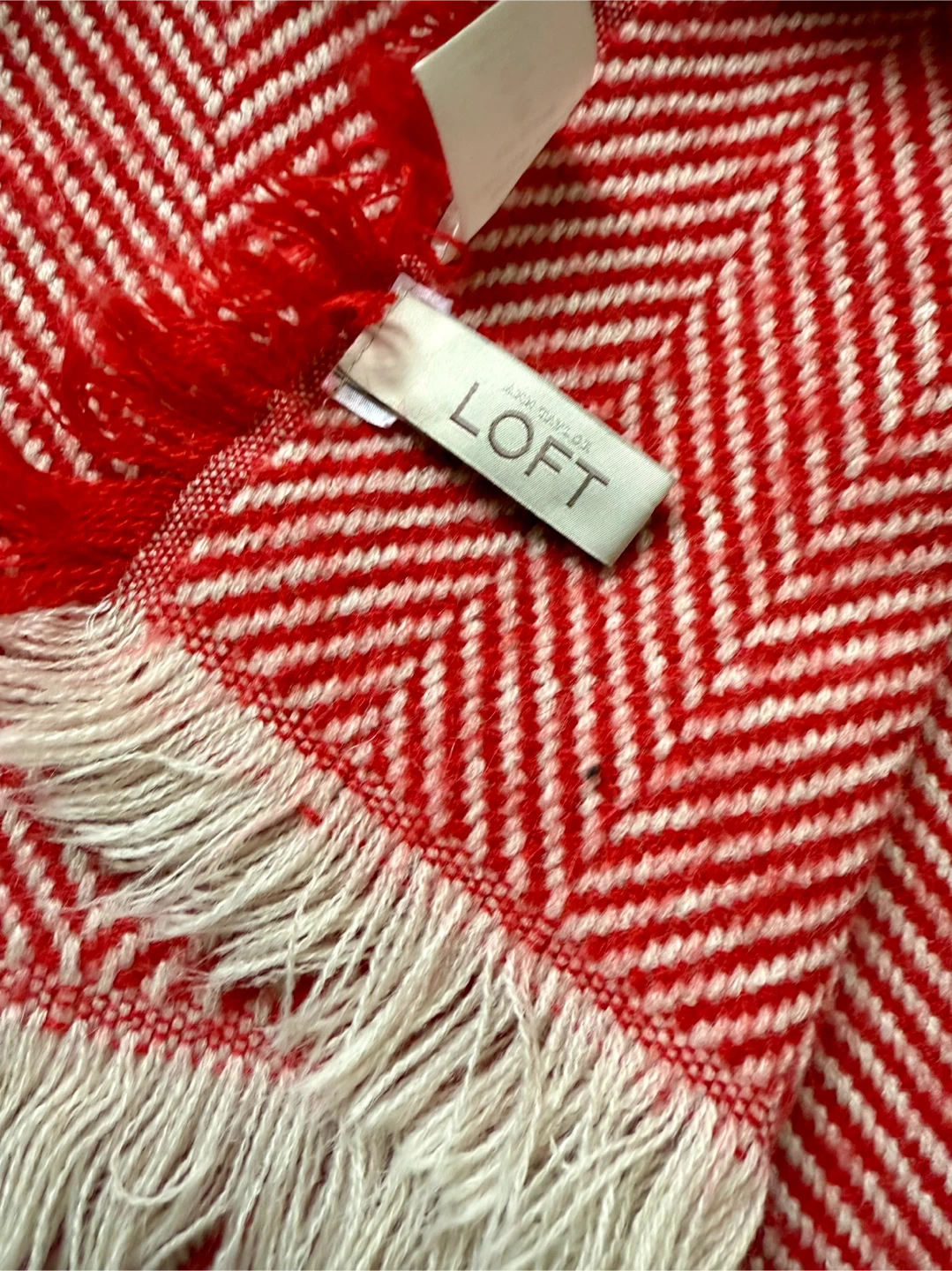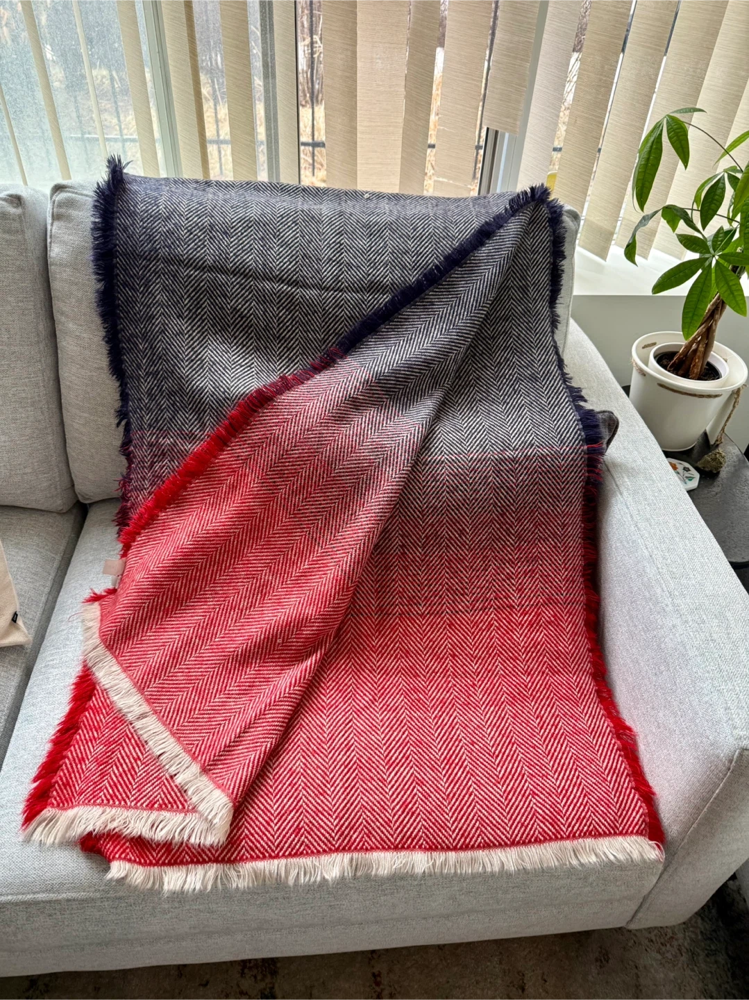 Classic herringbone pattern in red, white, and blue, with fringed edges