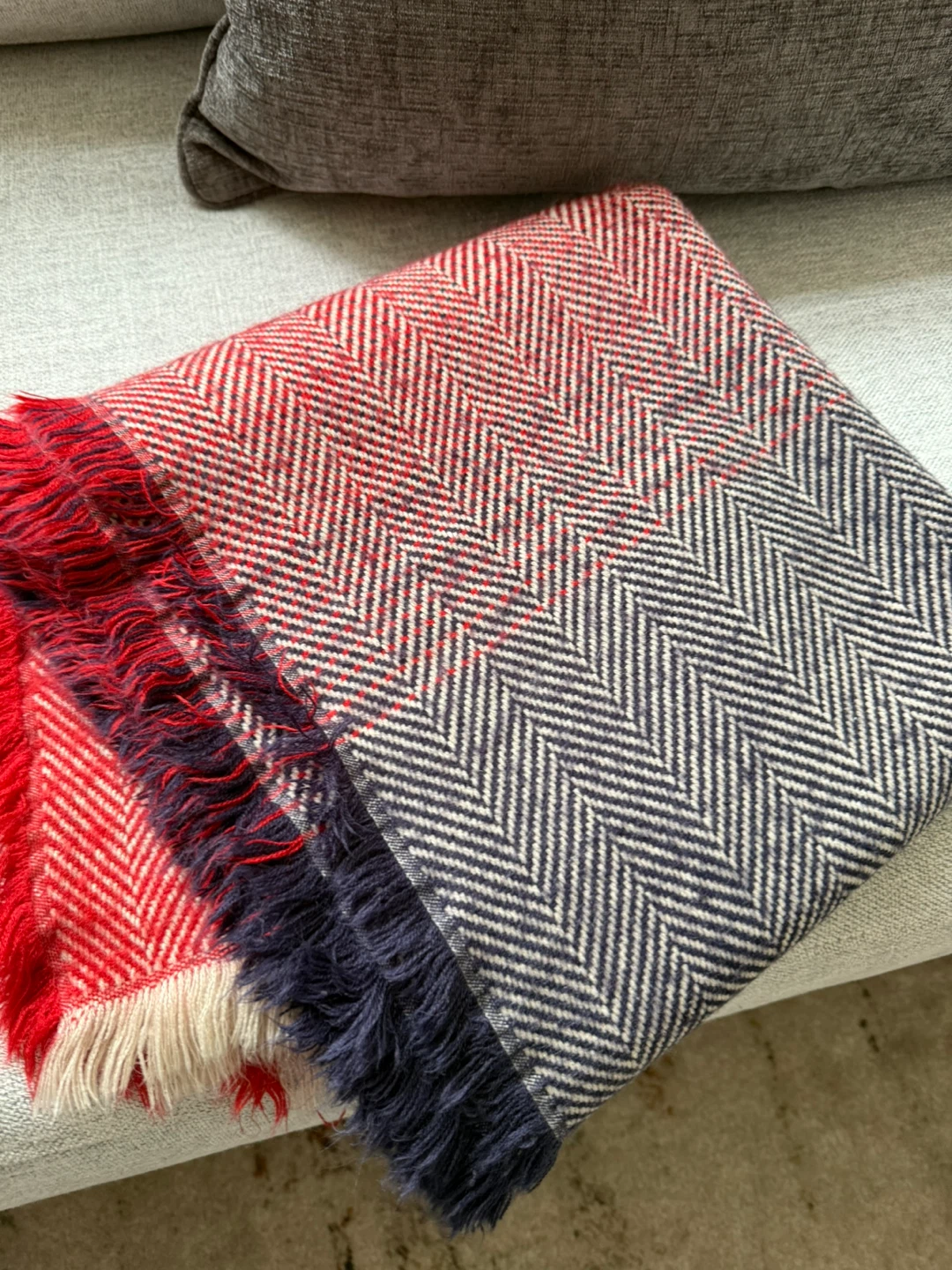 Classic herringbone pattern in red, white, and blue, with fringed edges