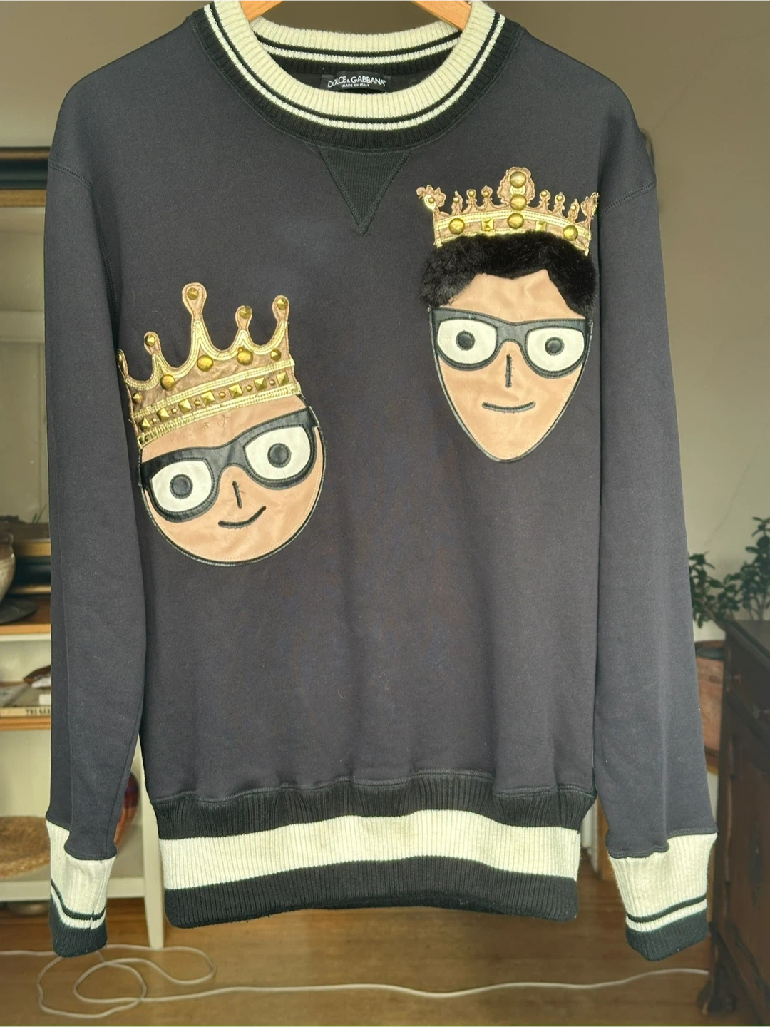 Check out this stylish Dolce & Gabbana sweater! It's a size M and made from 100% cotton. The sweater features a fun design with crowns and faces, plus a cool #dgfamily detail on the back. Perfect for adding a bit of flair to your wardrobe.