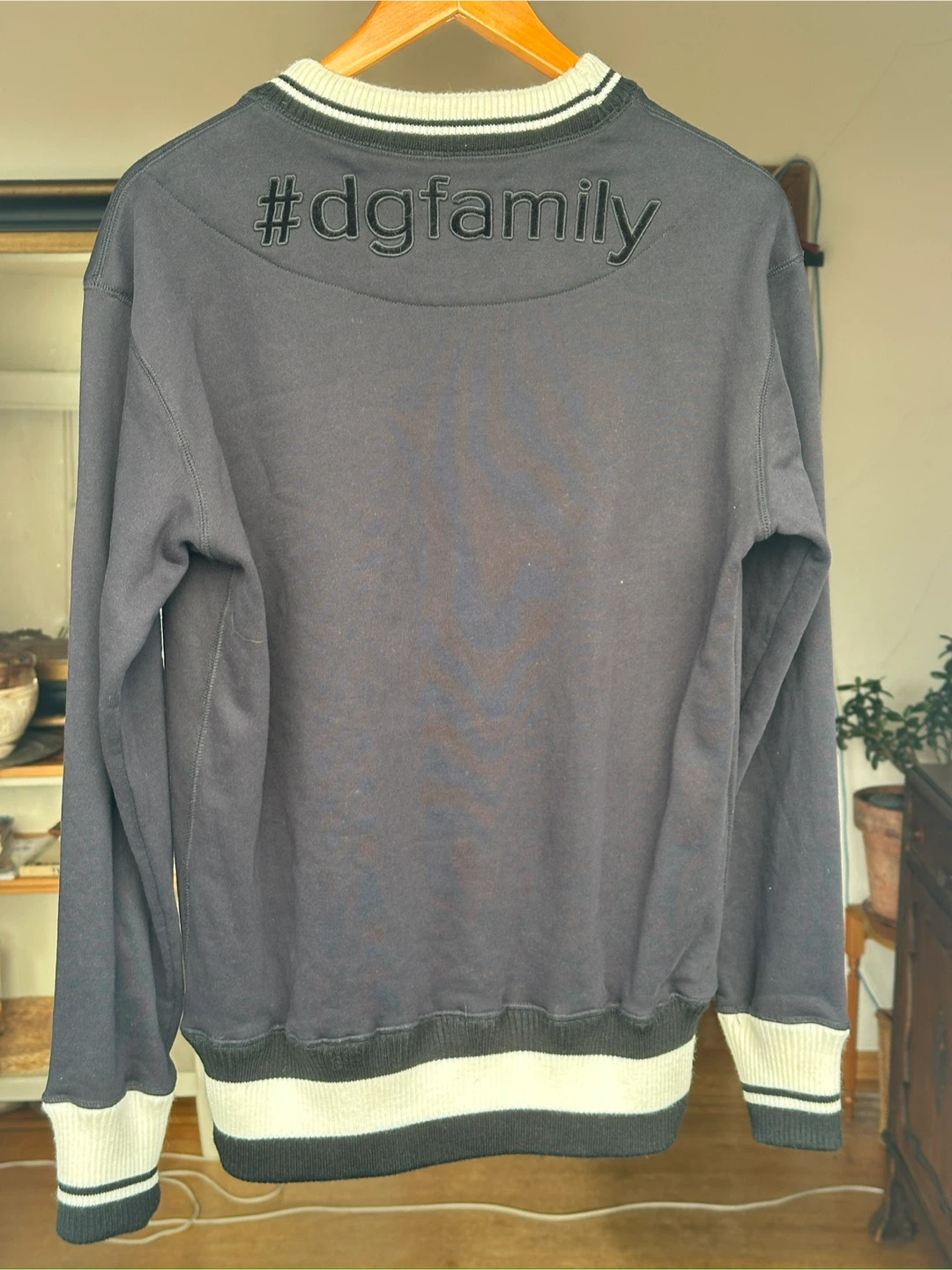 Check out this stylish Dolce & Gabbana sweater! It's a size M and made from 100% cotton. The sweater features a fun design with crowns and faces, plus a cool #dgfamily detail on the back. Perfect for adding a bit of flair to your wardrobe.