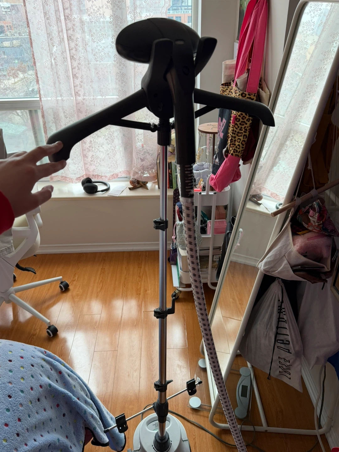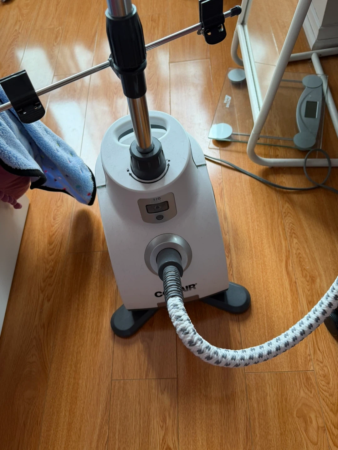 This Conair garment steamer is white and comes with a stand and hose. It's ready for use! Great for de-wrinkling clothes.