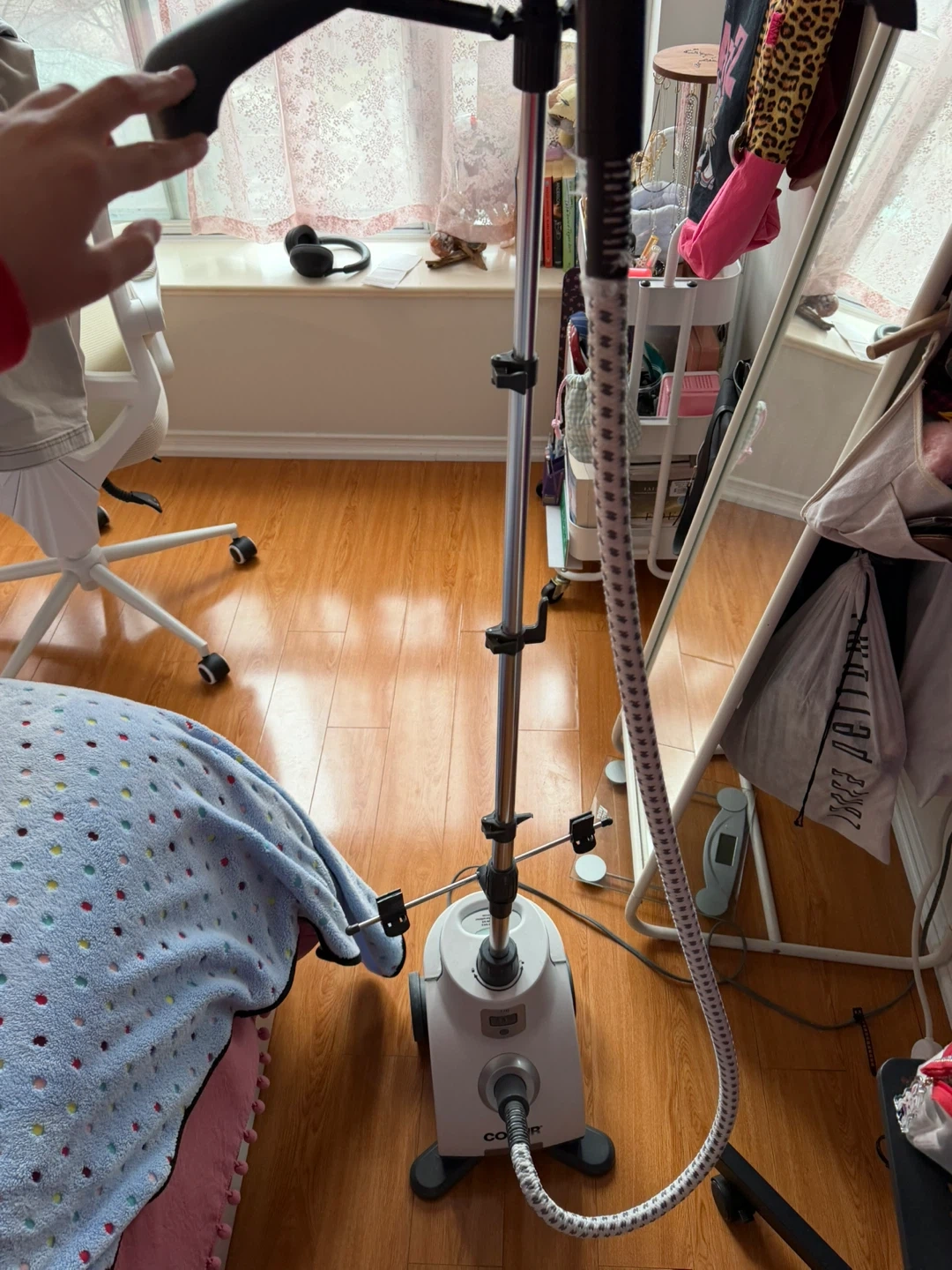 This Conair garment steamer is white and comes with a stand and hose. It's ready for use! Great for de-wrinkling clothes.
