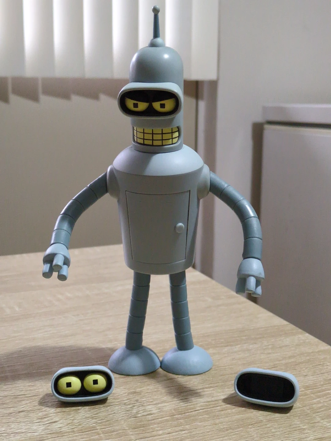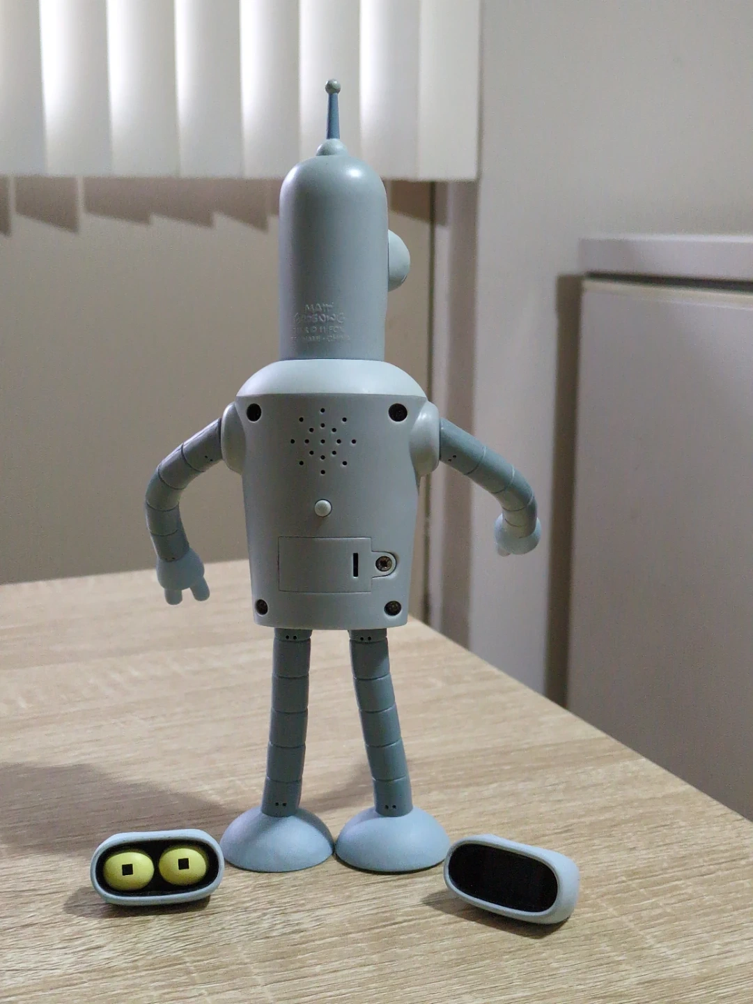 Talking Bender doesn't come with a box. One of the eyepieces is missing but not its frame. Check pictures for clarity.