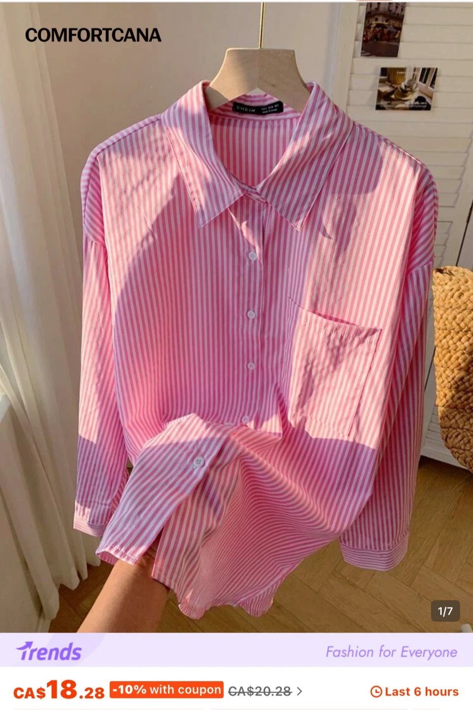 A classic pink and white striped button-up shirt from SHEIN. It features a breast pocket and a collared neckline. Made from lightweight fabric, it's a comfy addition to any casual wardrobe. Size is medium.