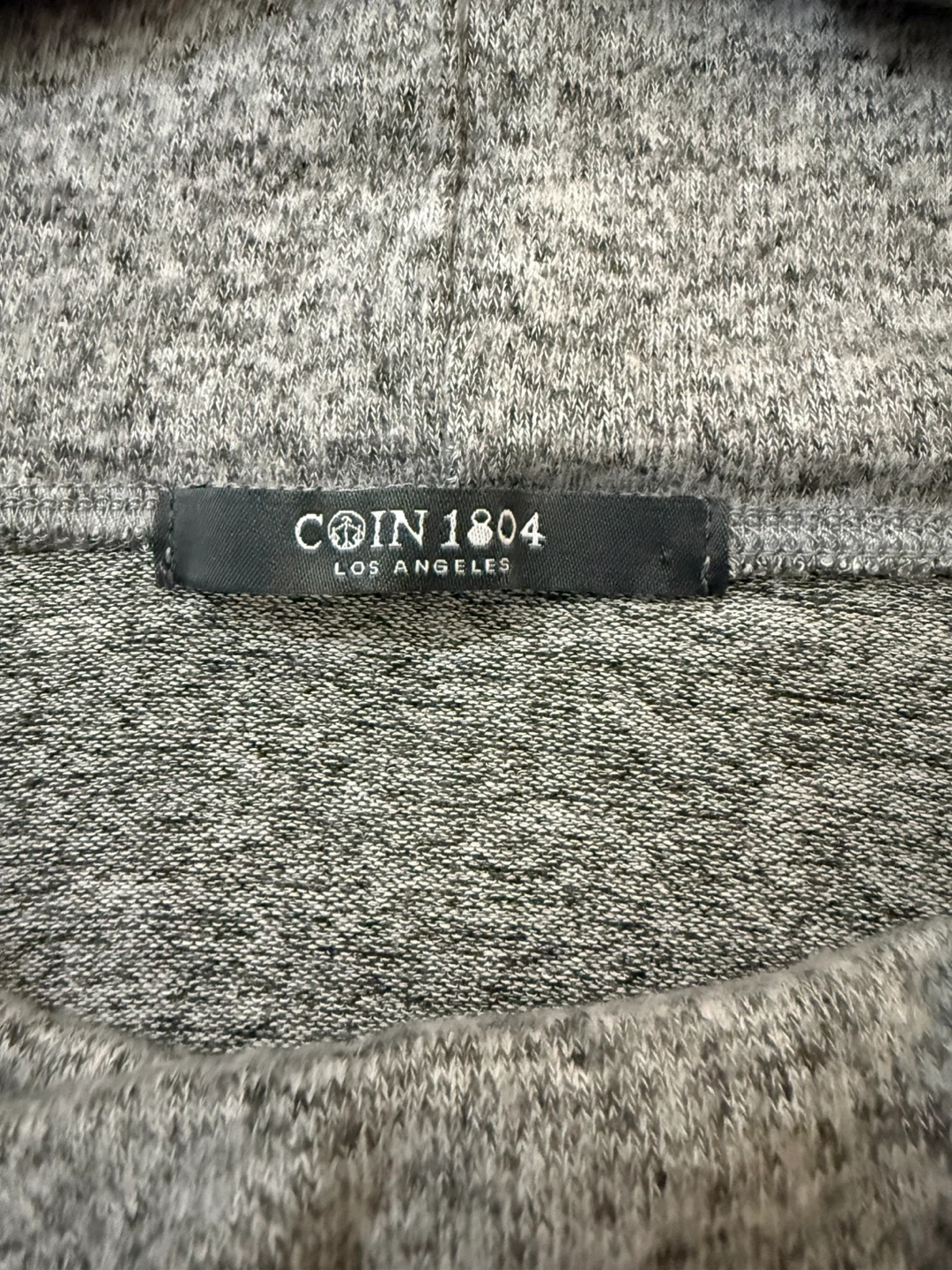 COIN 1804 grey cowl neck sweater. It's a size 3X and made from 74% polyester, 21% rayon, and 5% spandex. This sweater is made in USA. It's comfortable for casual wear.