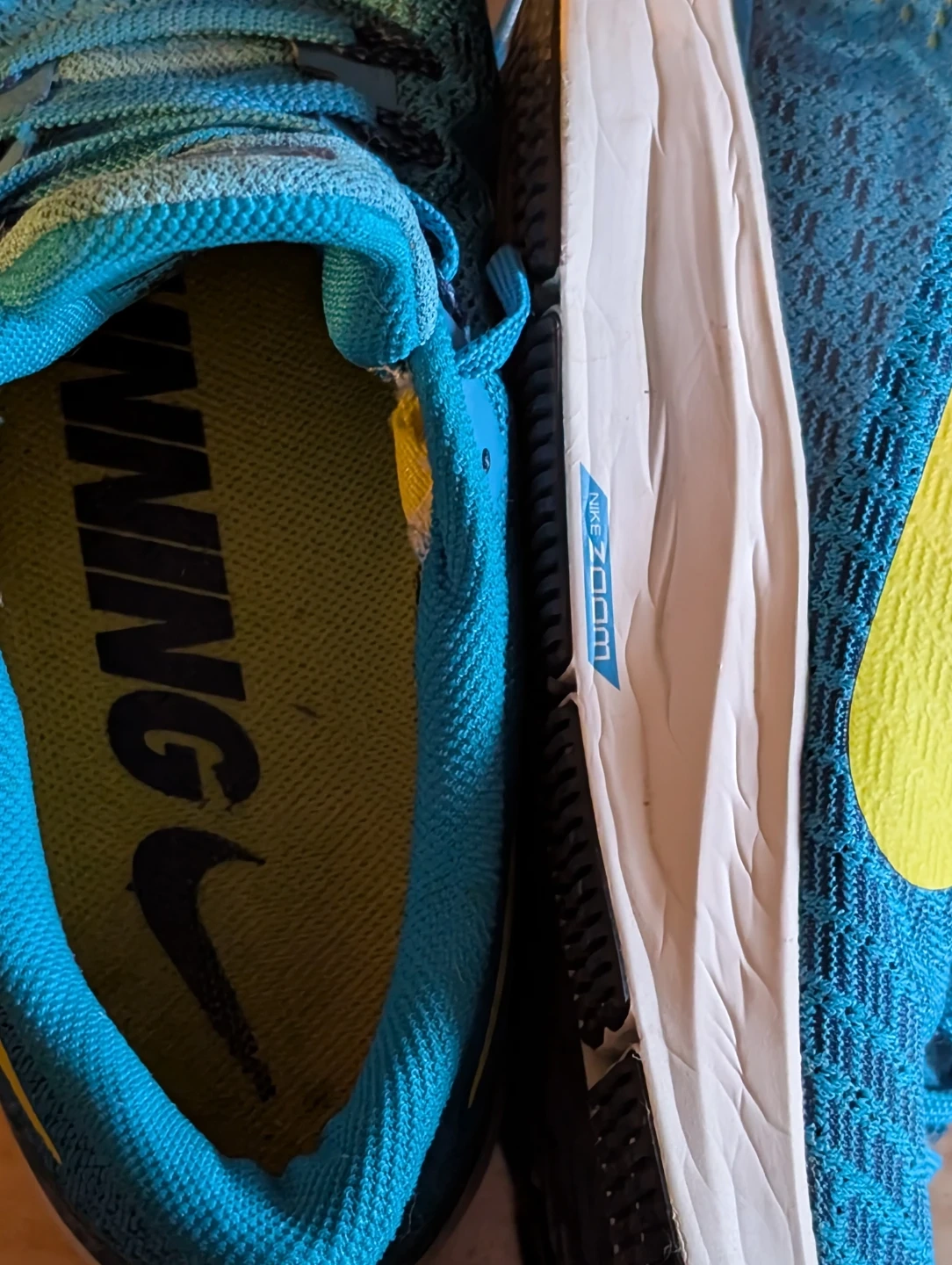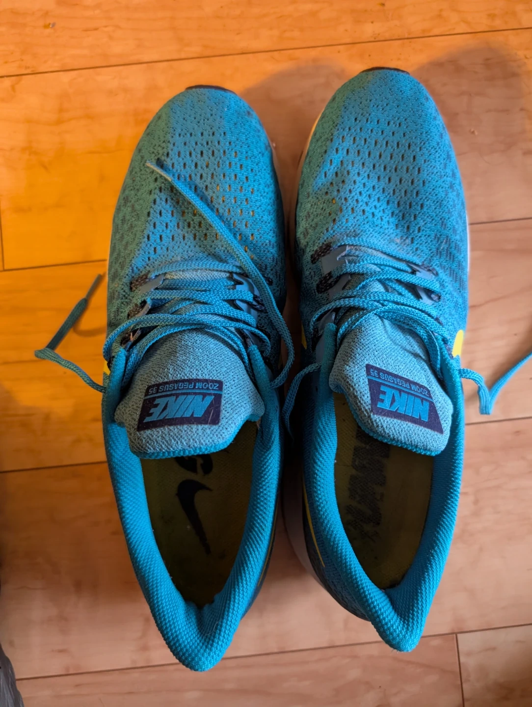 These are Nike Zoom Pegasus 35 running shoes(Size13) in a turquoise and yellow colourway. They're designed for comfort and performance on your runs. Mesh upper for breathability.