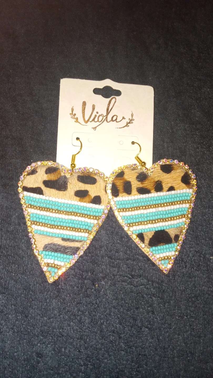 Heart-shaped earrings from Viola. Features a leopard print design with turquoise and white beaded accents, outlined with rhinestones. Dangling fish hook backs.