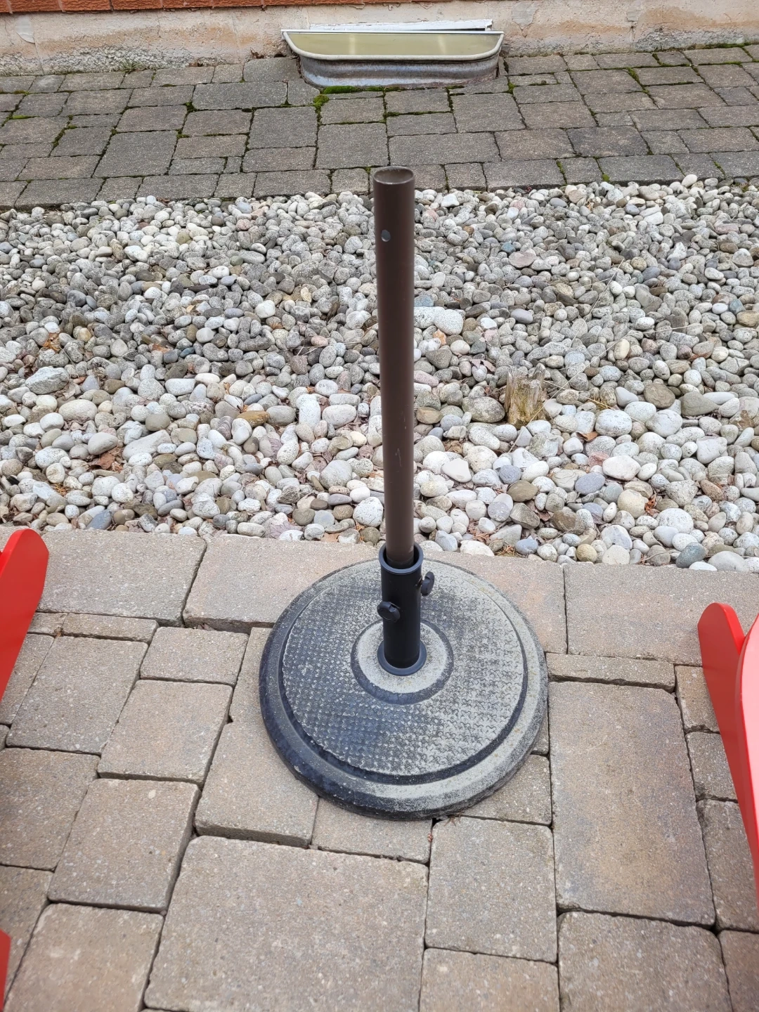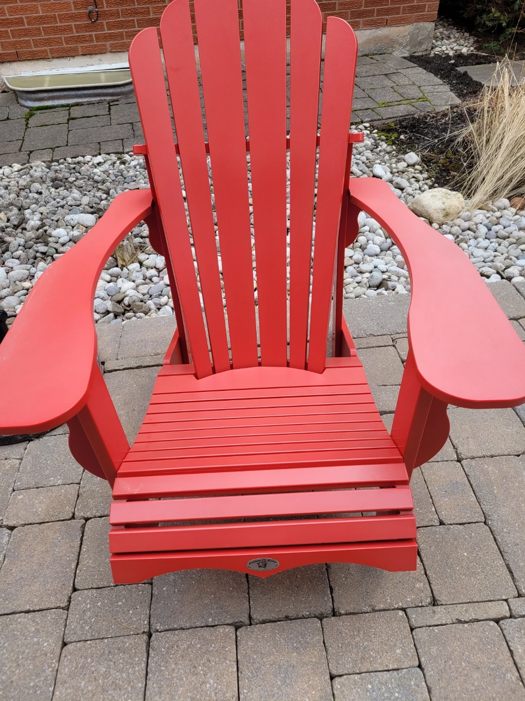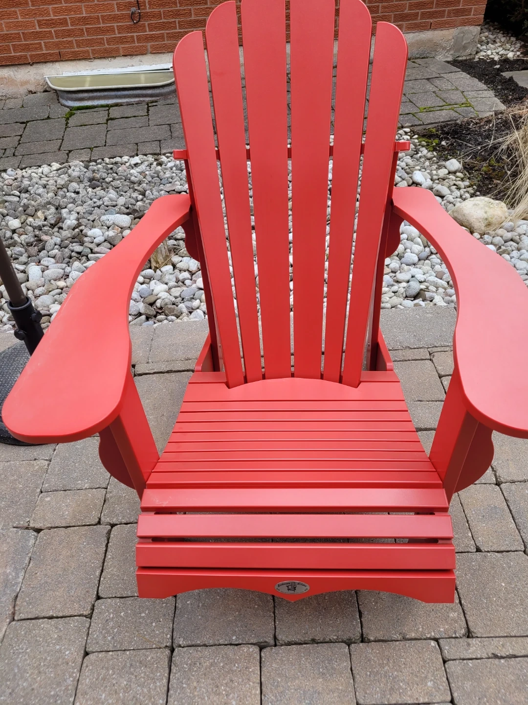 Classic red Adirondack chair for your patio or backyard. Includes a matching red patio umbrella and a sturdy umbrella base. Perfect for relaxing outdoors!