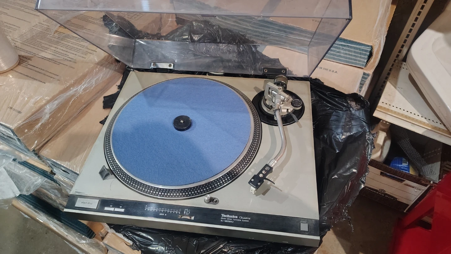 This is a Technics SL-1800MK2 direct drive turntable system. It features quartz lock for stable speed control. The tonearm is present and appears functional.