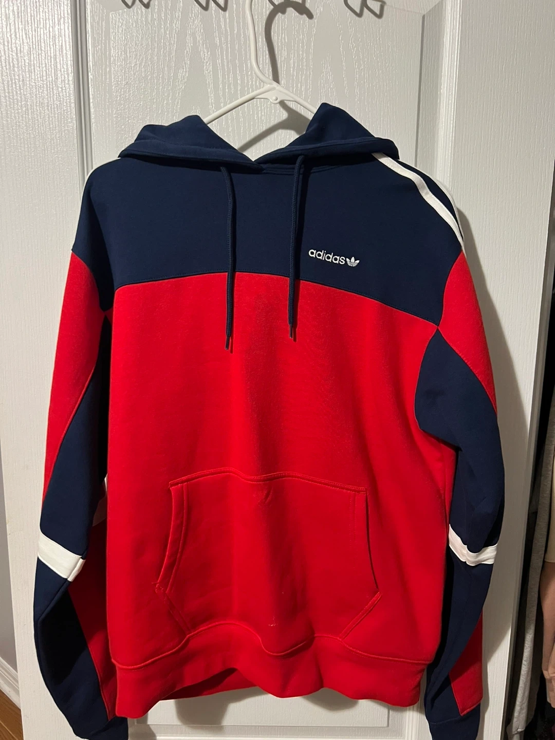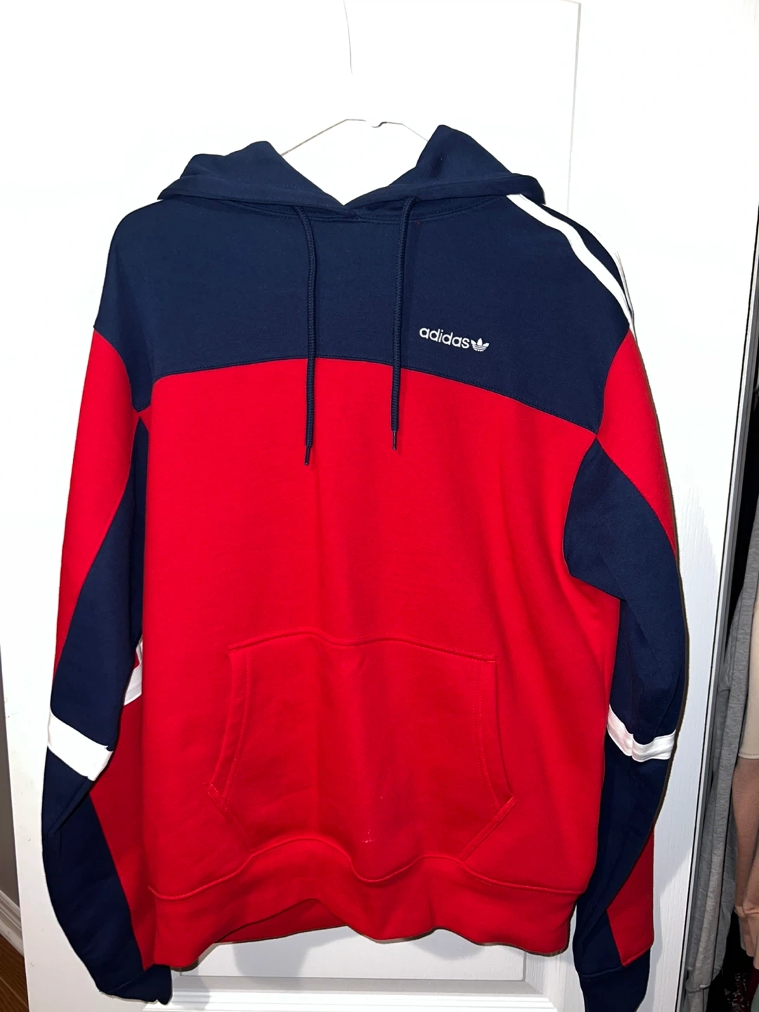 This Adidas hoodie features a colourblock design with navy and red panels and white stripe detailing on the sleeves. It has a front kangaroo pocket and an adjustable drawstring hood. A comfortable and stylish addition to any casual wardrobe!