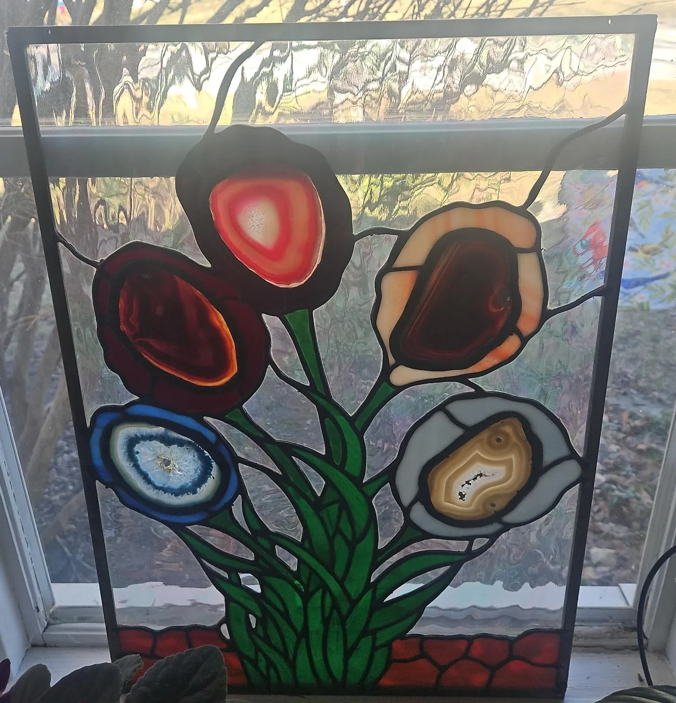 This stained glass sun catcher features a bouquet of flowers, with real agate slices forming the petals. (Helps with healing) The green glass leaves and red brick-patterned base complete the design. It catches the light beautifully!