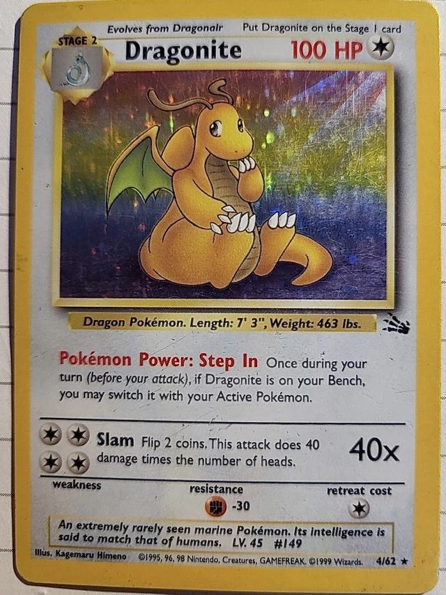 Featuring Dragonite, this rare Pokémon card comes with a Dragon Pokémon, length: 7' 3", weight: 463 lbs. Though previously loved, it's in great condition, ready to bring a surge of nostalgia to your collection! Additional specifications include: * Pokémon Power: Step-In * Slam: Flip 2 coins * 40x damage times the number of heads * Weakness: Grass * Resistance: Fighting Given the market for these cards, I'm listing it at $80.00. It would be an excellent addition to your collection, don't you think? If you're seeing this, it's still available! Grab it before it flies away!