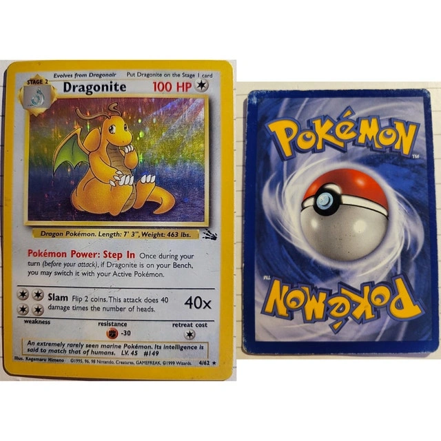 Featuring Dragonite, this rare Pokémon card comes with a Dragon Pokémon, length: 7' 3", weight: 463 lbs. Though previously loved, it's in great condition, ready to bring a surge of nostalgia to your collection! Additional specifications include: * Pokémon Power: Step-In * Slam: Flip 2 coins * 40x damage times the number of heads * Weakness: Grass * Resistance: Fighting Given the market for these cards, I'm listing it at $80.00. It would be an excellent addition to your collection, don't you think? If you're seeing this, it's still available! Grab it before it flies away!