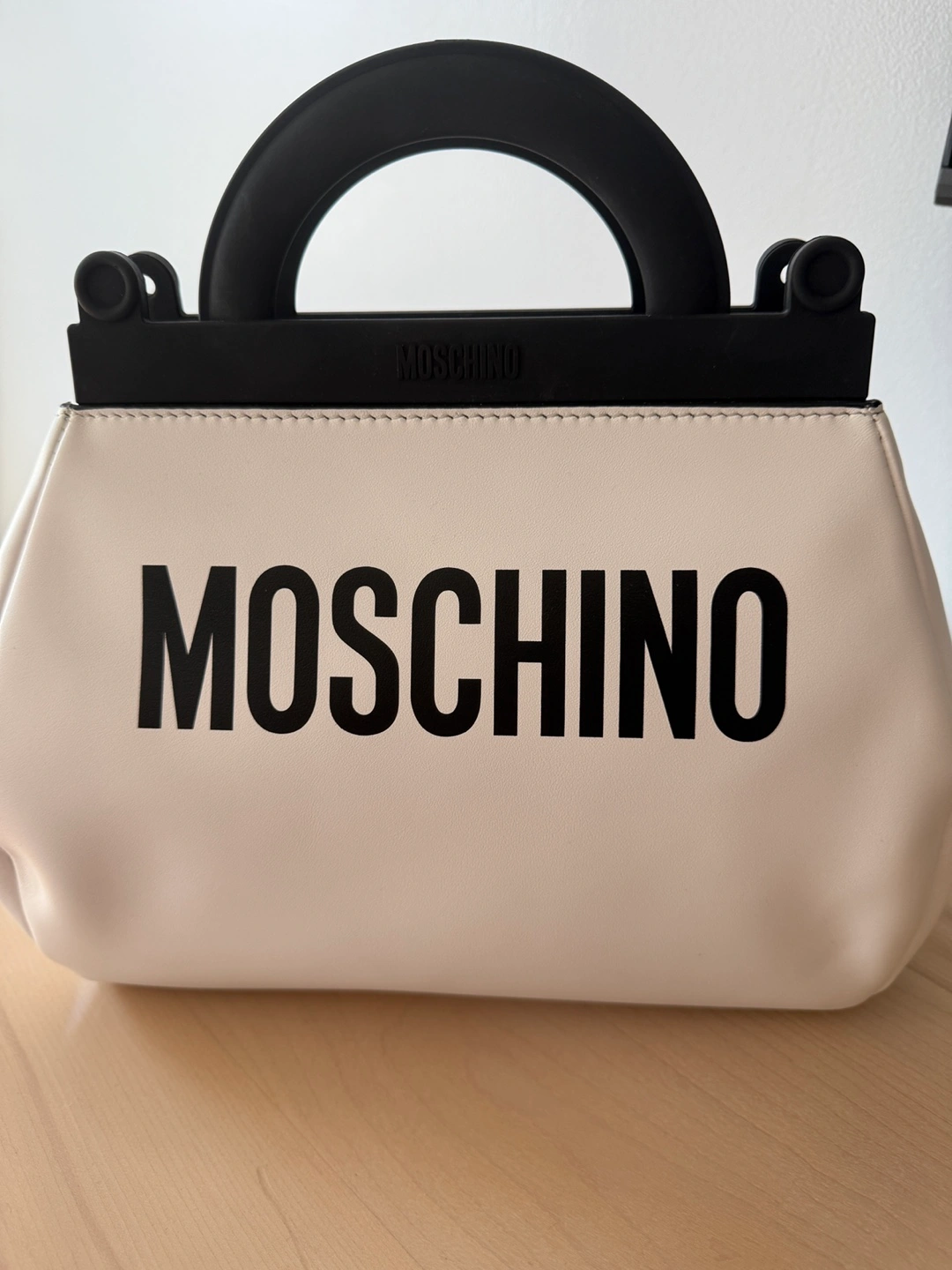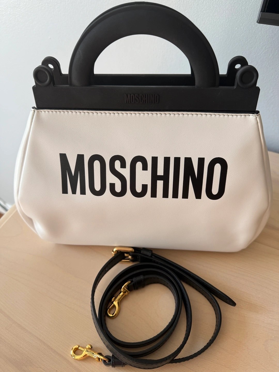 Selling a stylish Moschino top handle bag! It features a unique black top handle and a detachable black shoulder strap with gold-tone hardware. The bag is primarily white with the MOSCHINO logo in bold black letters. It's in excellent condition and ready for a new home