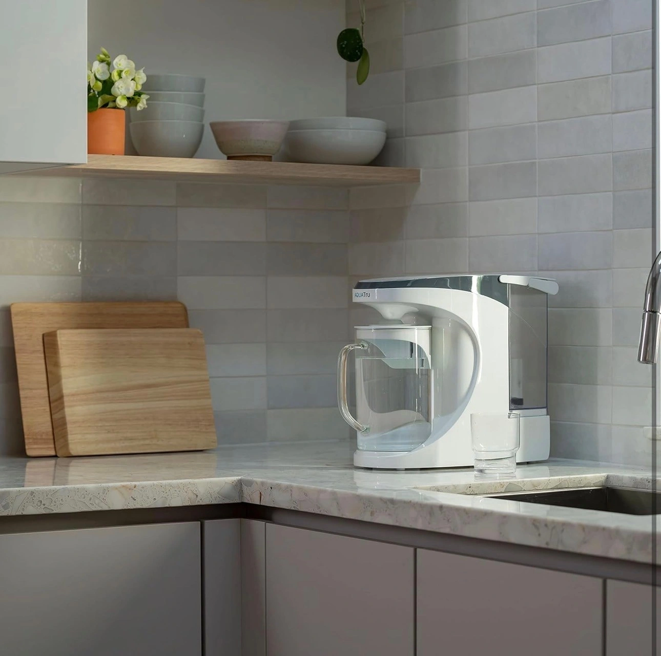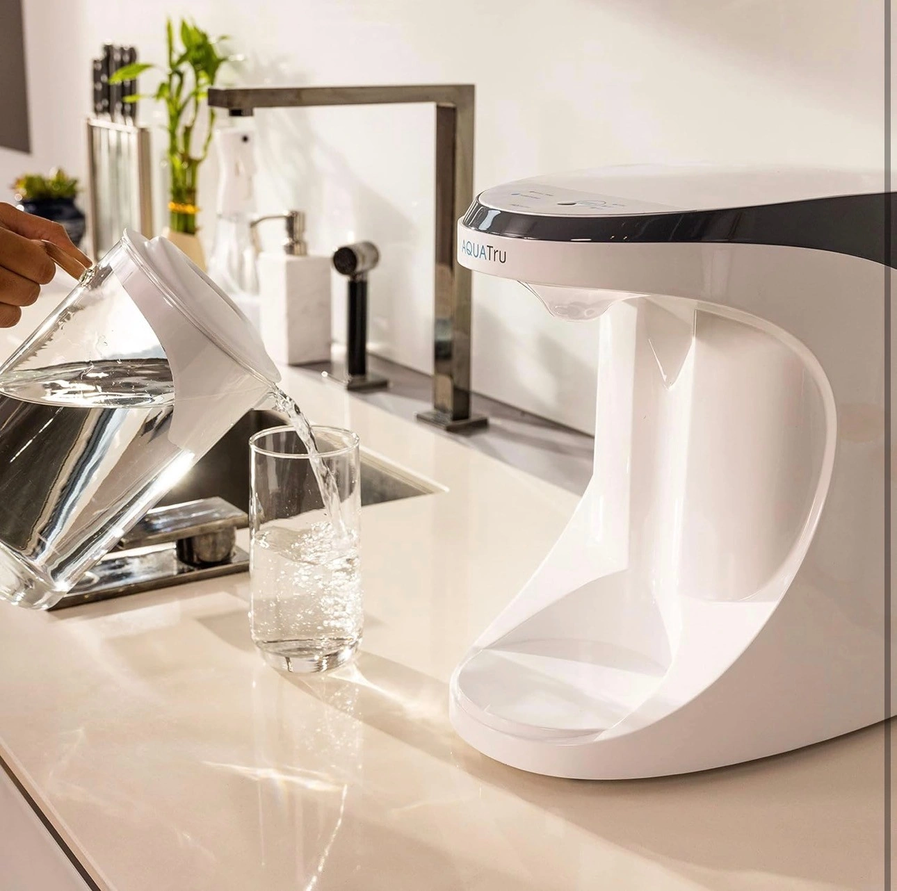 NO PLUMBING OR INSTALLATION required - takes just minutes to set up. AquaTru’s Trusted & warrantied RO countertop system COSTS CONSIDERABLY LESS than fully installed under-the-counter RO systems, while at the same time, delivering often Cleaner, Purer, and Better Tasting Water. Why waste money & add to landfills with bottled water (93% recently found to contain micro-plastics)? Forget about the hassle & cost of buying bottled water