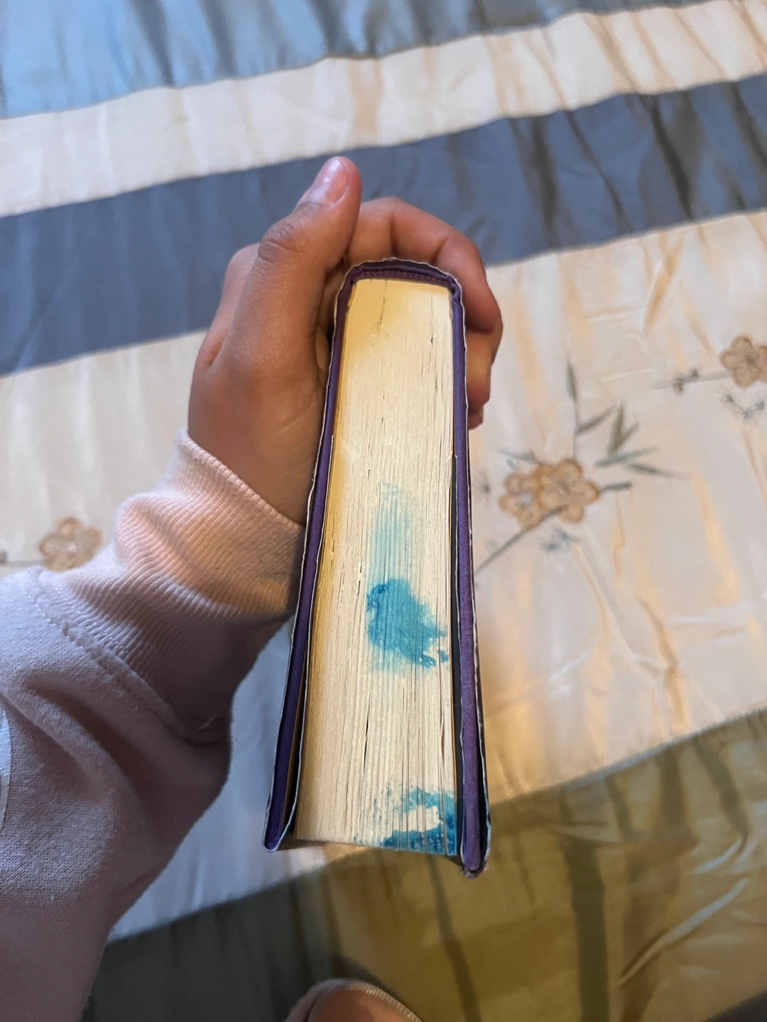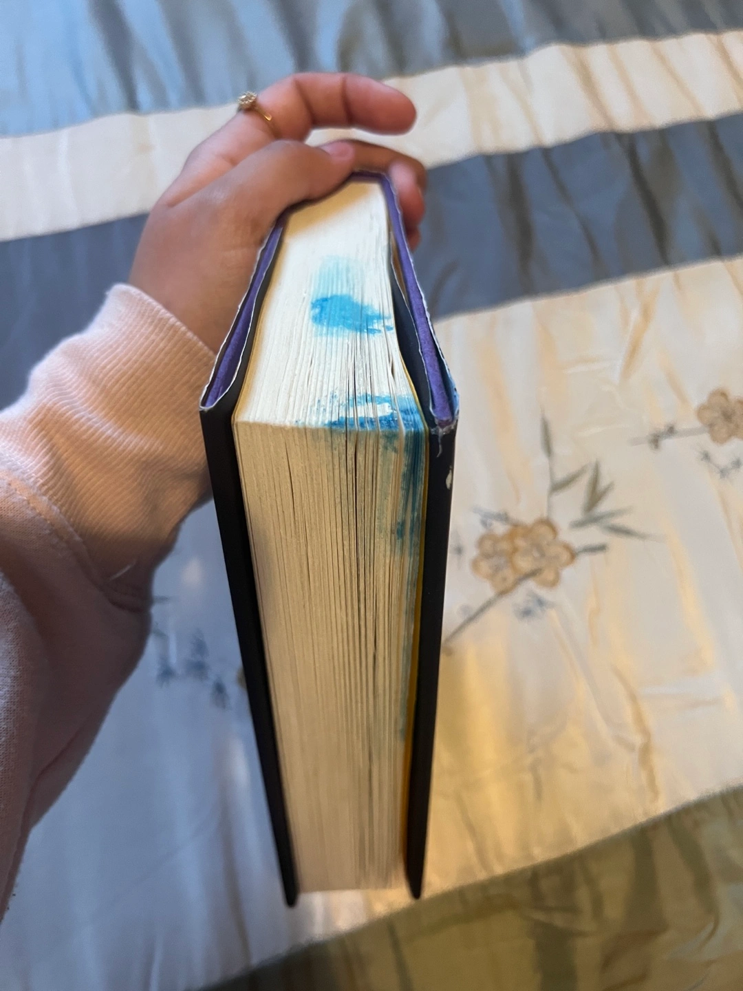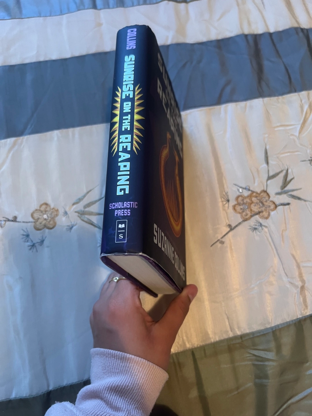Sunrise on the Reaping by Suzanne Collins. It’s brand new, bought in April, but unfortunately some blue icing got stuck to the top. it’s dry and it can be easily painted over if you’re crafty.