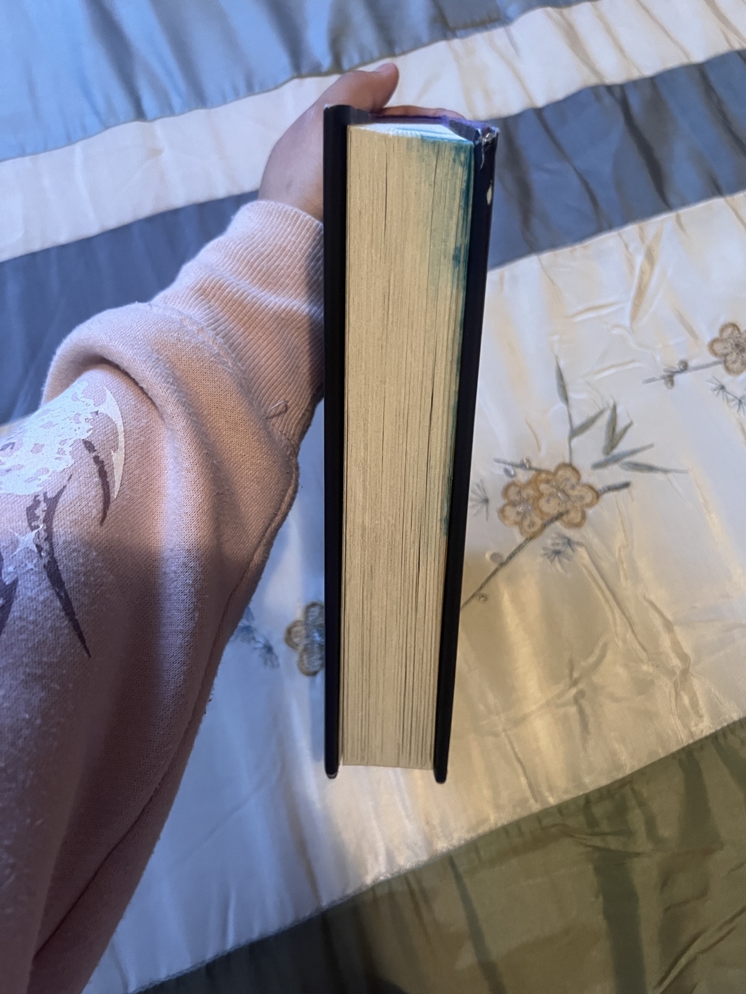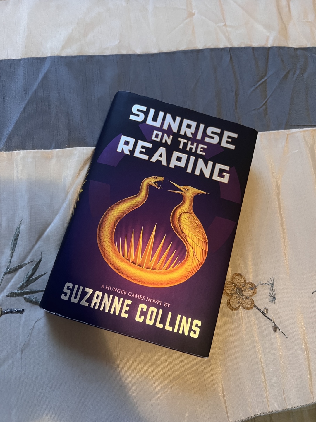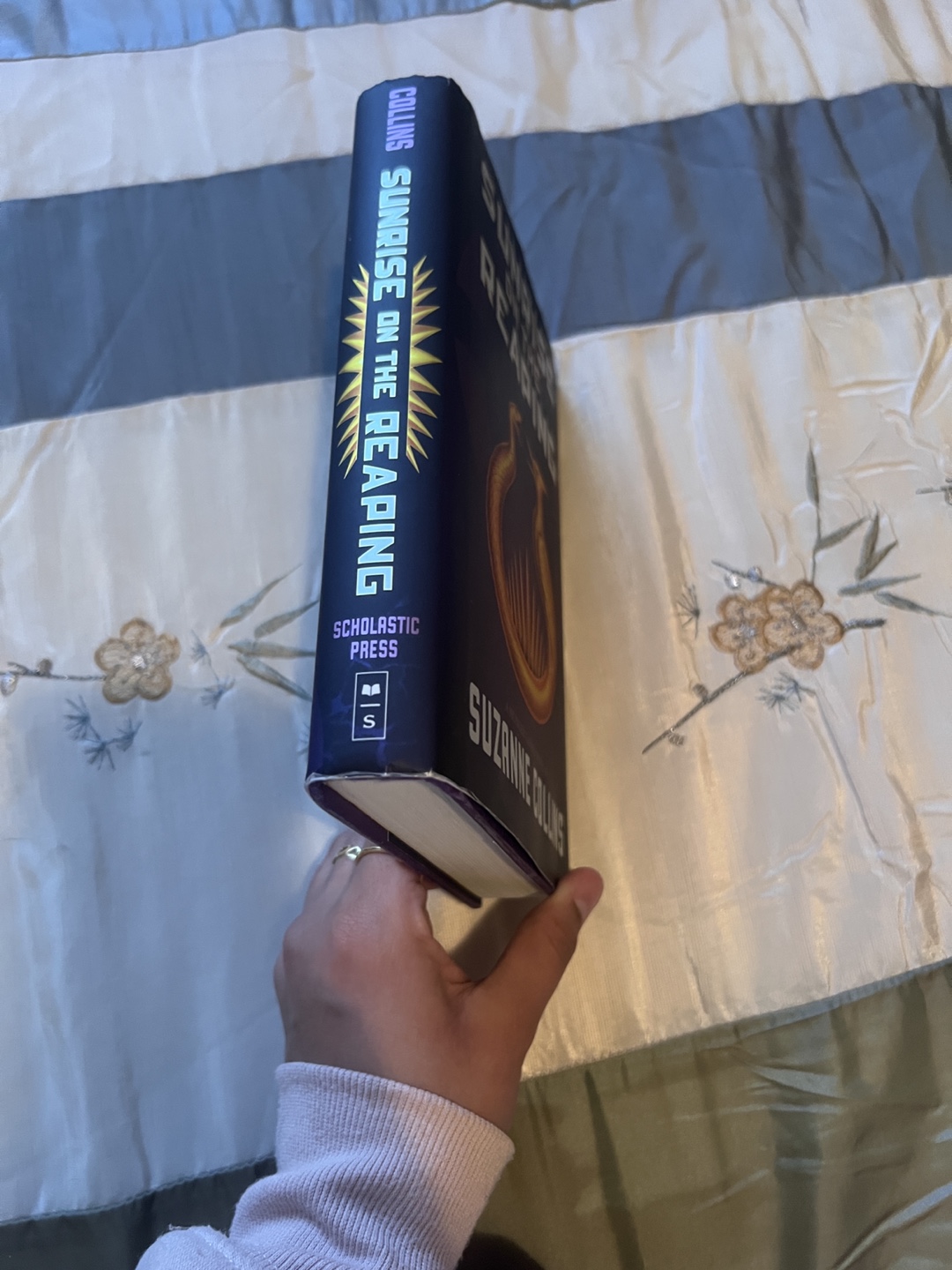 Sunrise on the Reaping by Suzanne Collins. It’s brand new, bought in April, but unfortunately some blue icing got stuck to the top. it’s dry and it can be easily painted over if you’re crafty.