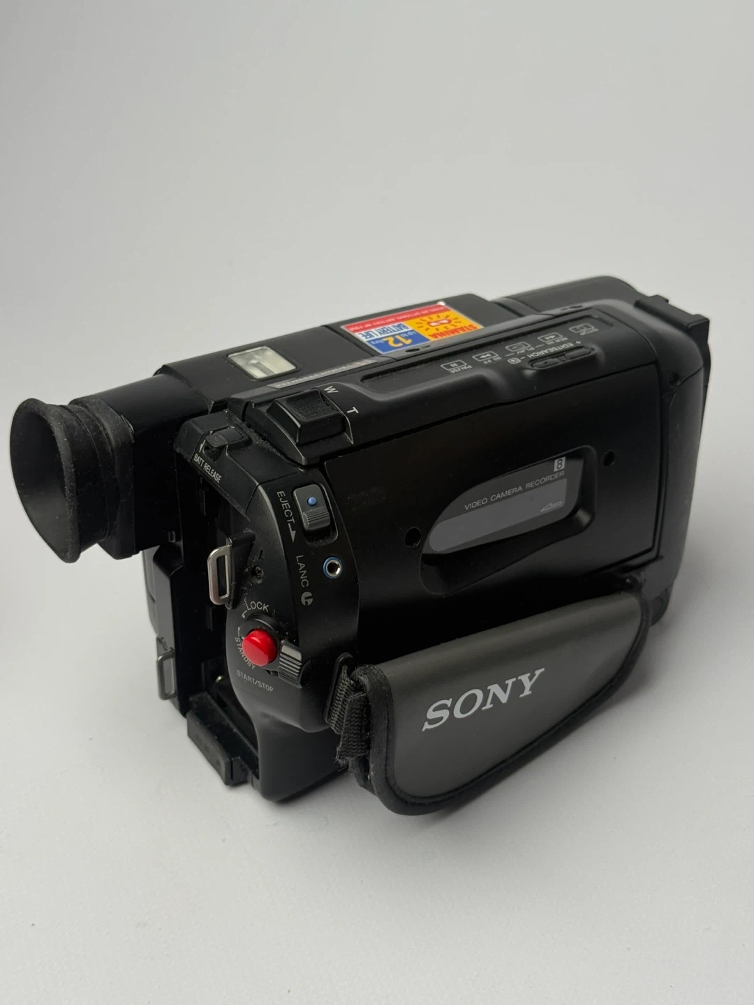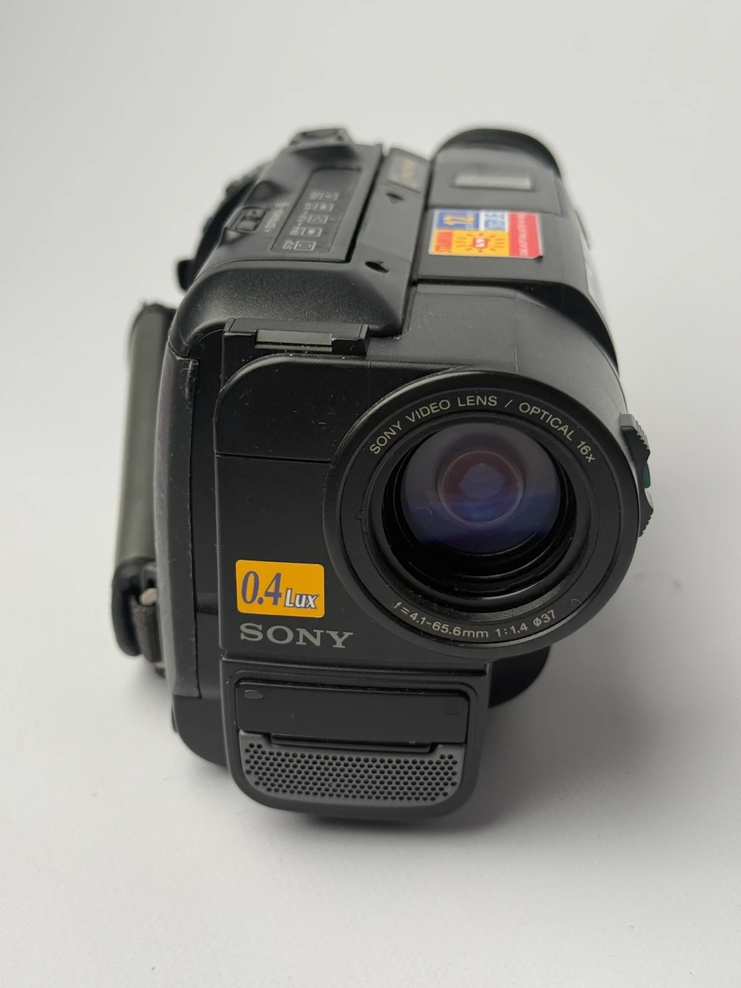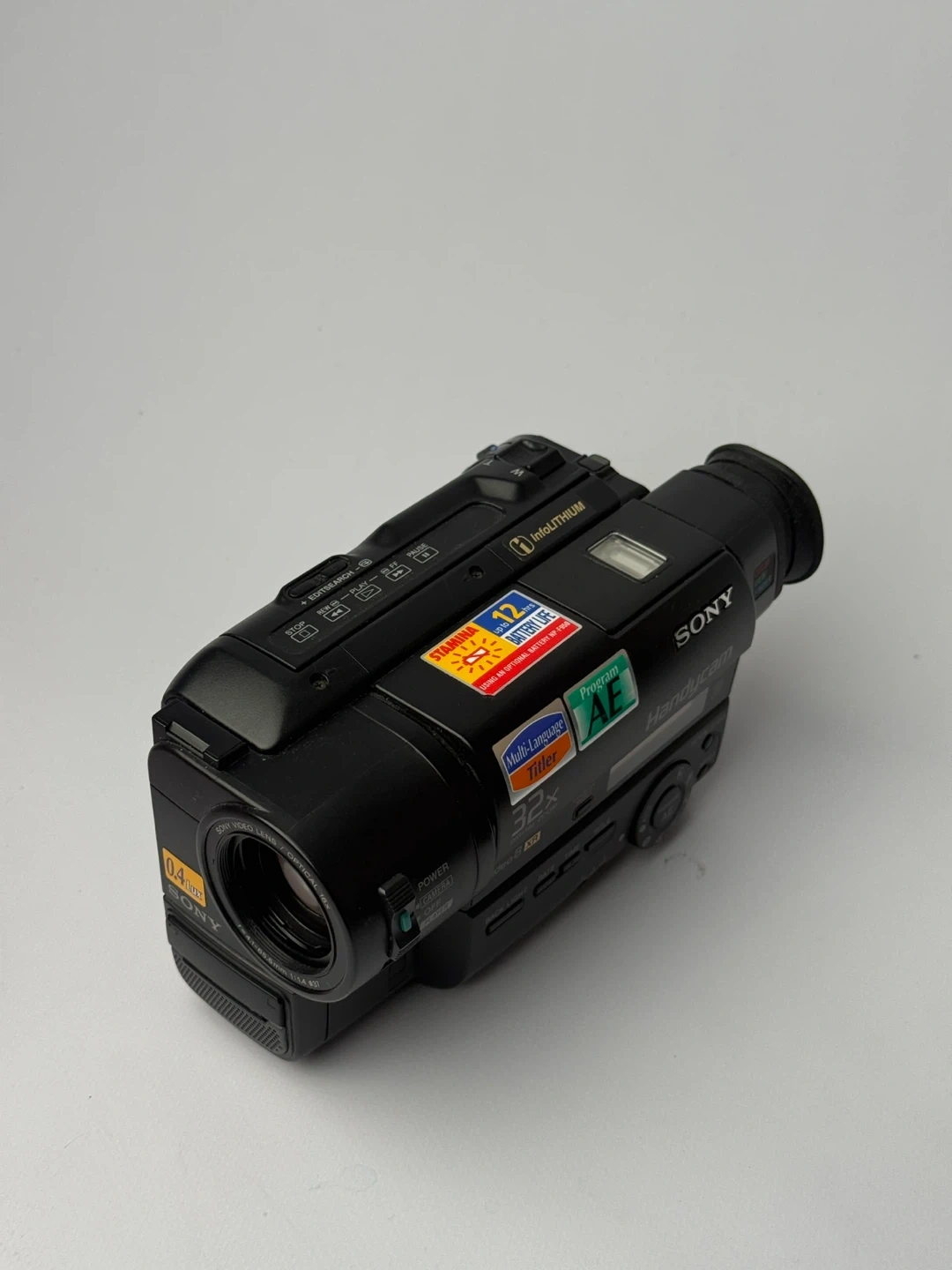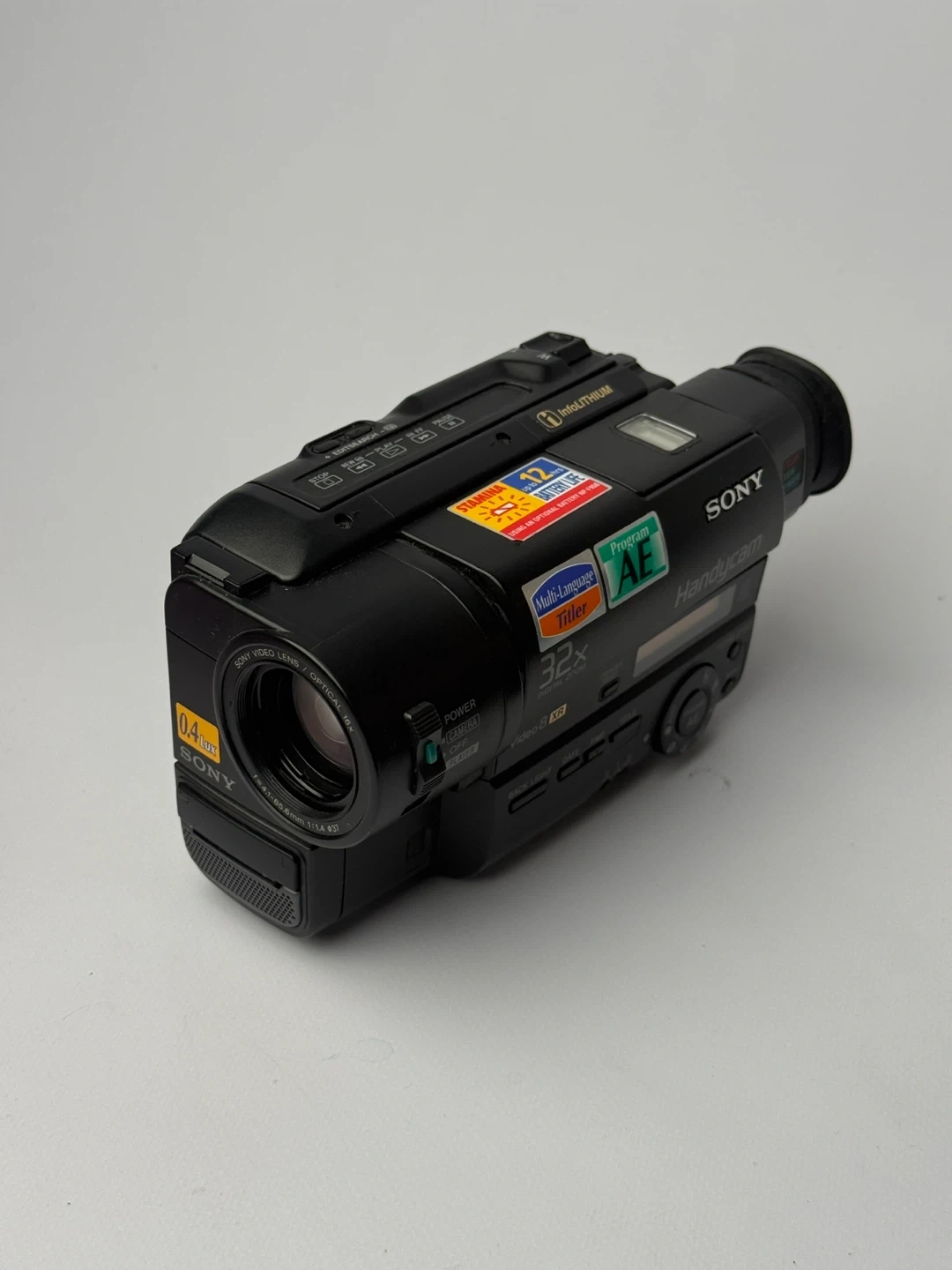 Black Sony Handycam camcorder. Features 32x optical zoom and 0.4 Lux low-light capability. Includes the "Stamina" InfoLithium battery system for extended recording. A great way to capture memories on tape!