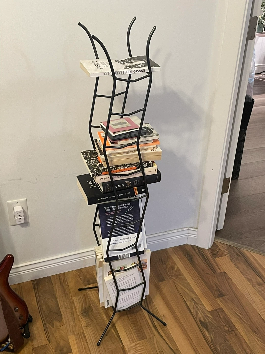 A sleek black metal rack perfect for organizing magazines or displaying books. Its unique wavy design adds a modern touch to any room. Sturdy metal construction ensures durability for your reading collection.