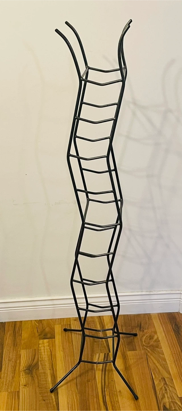 A sleek black metal rack perfect for organizing magazines or displaying books. Its unique wavy design adds a modern touch to any room. Sturdy metal construction ensures durability for your reading collection.