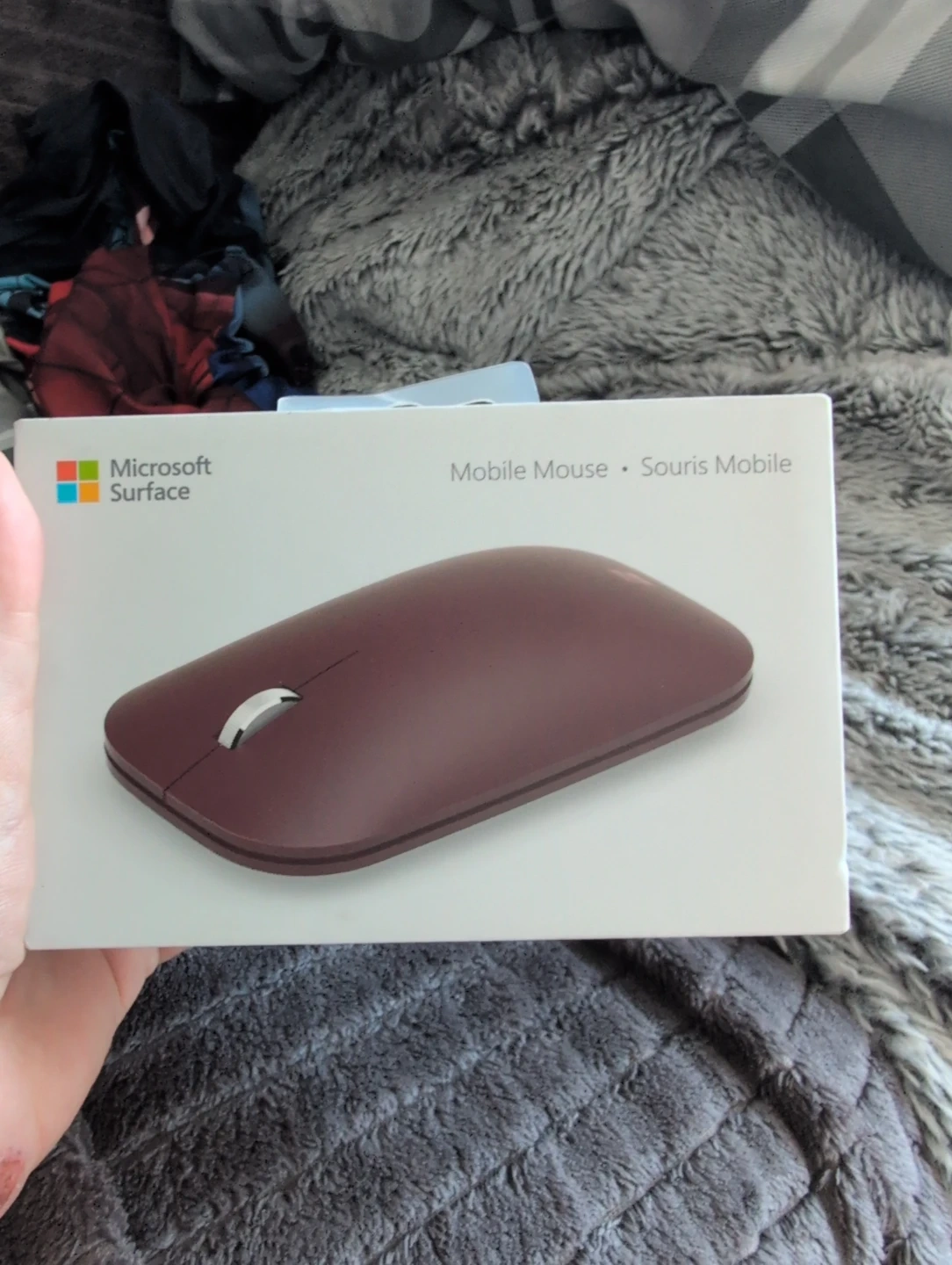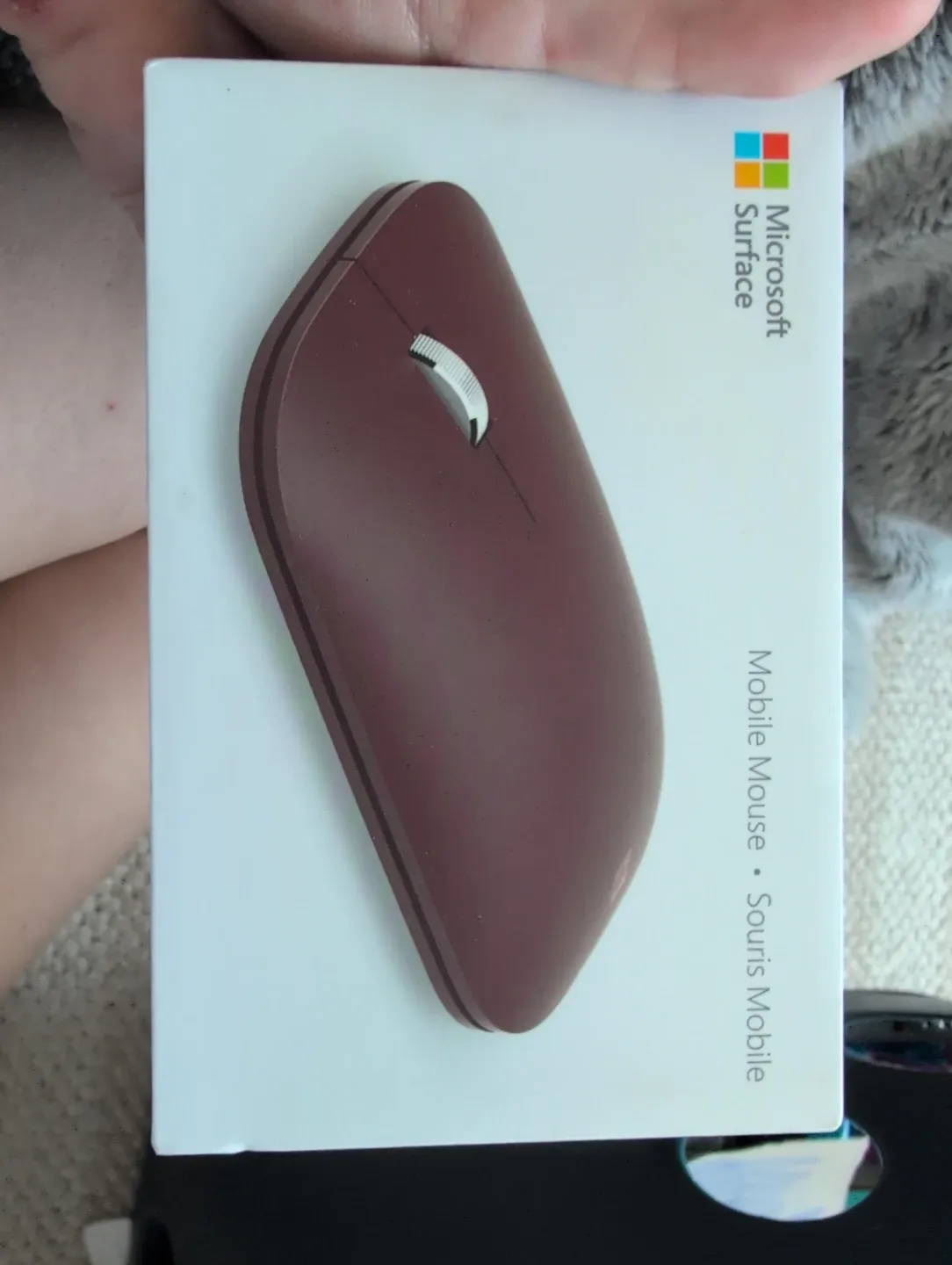 Microsoft Surface Mobile Mouse in a deep burgundy colour. It's a sleek and portable mouse designed for on-the-go productivity. Wireless connectivity.