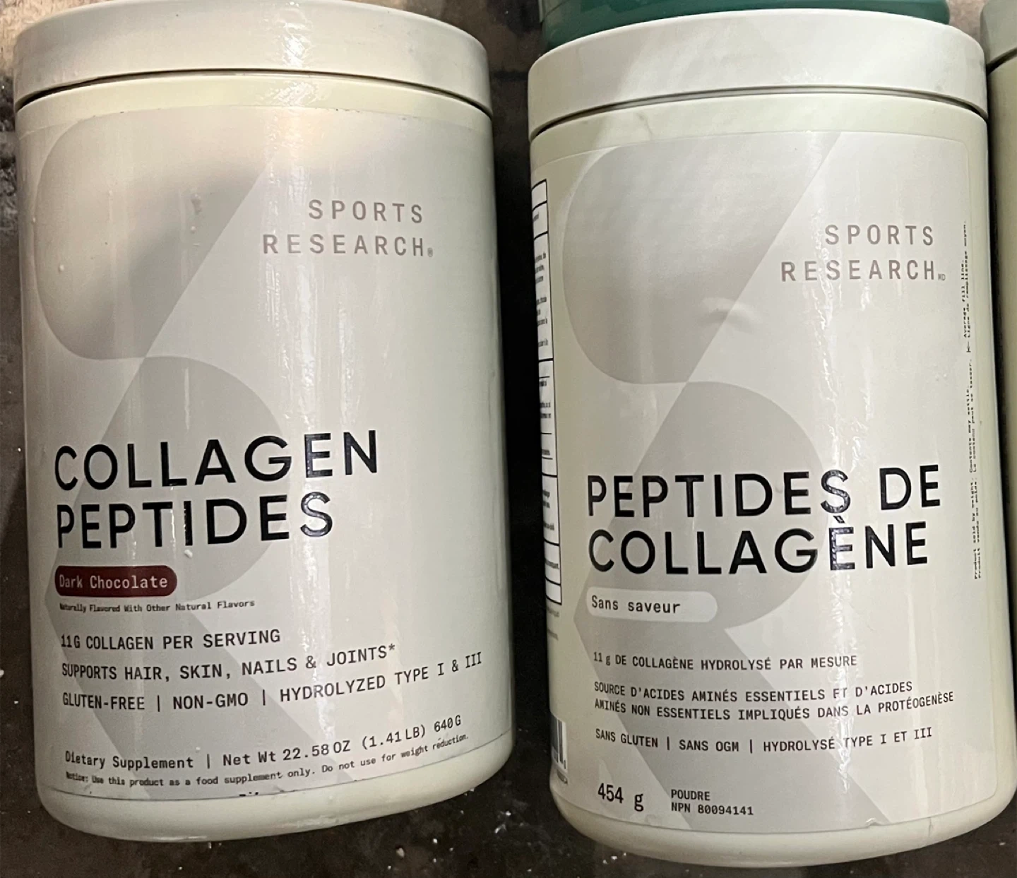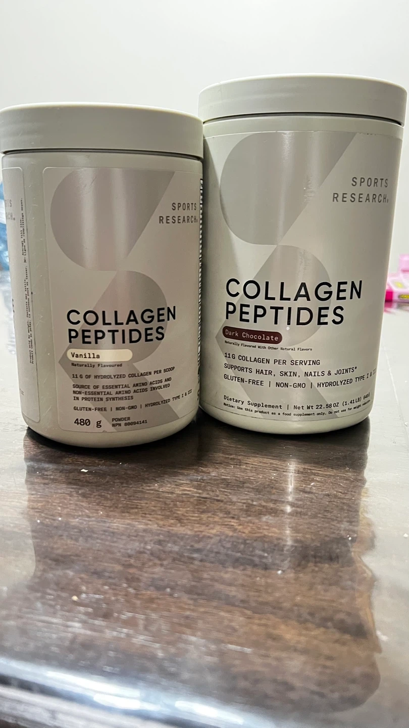Two canisters of Sports Research Collagen Peptides. One is vanilla flavour, 480g. The other is dark chocolate flavour, 22.58 oz (640g). Both are dietary supplements.