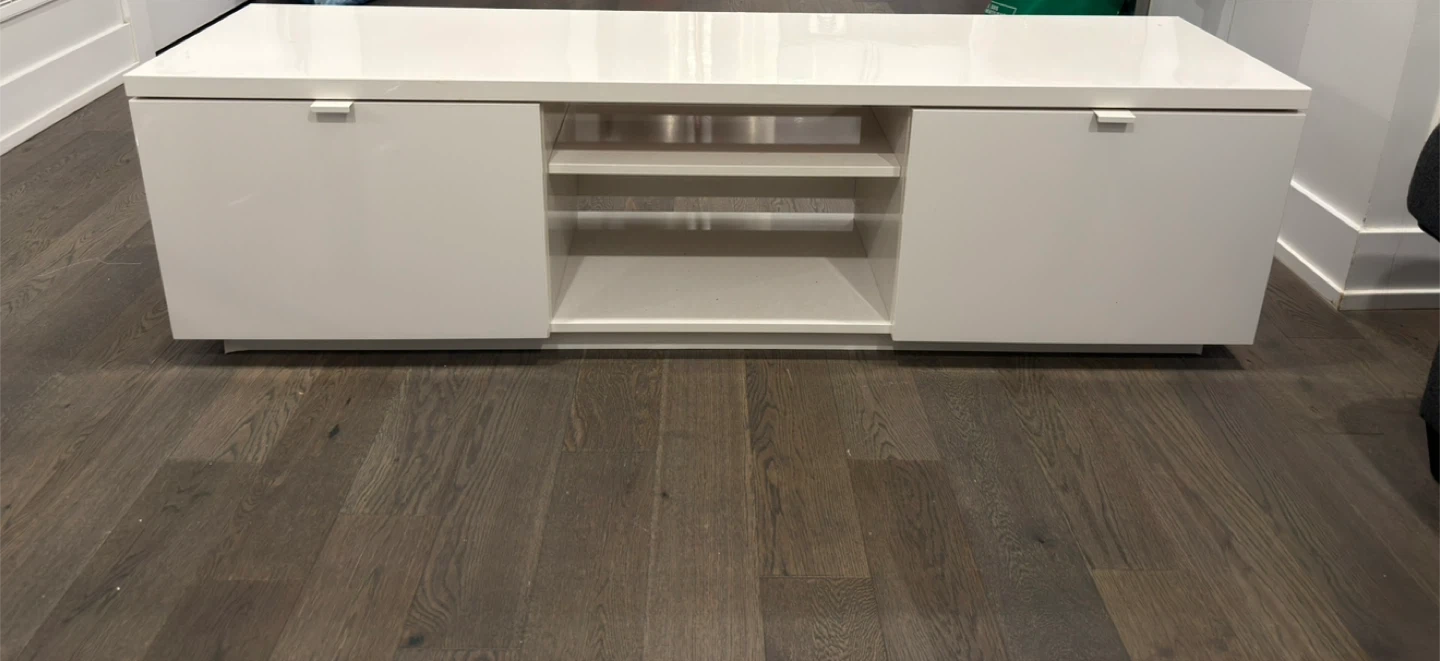 This is a clean, modern white TV stand. It features two cabinet doors on the sides and open shelving in the middle for media components. Its glossy finish would look great in any living room!