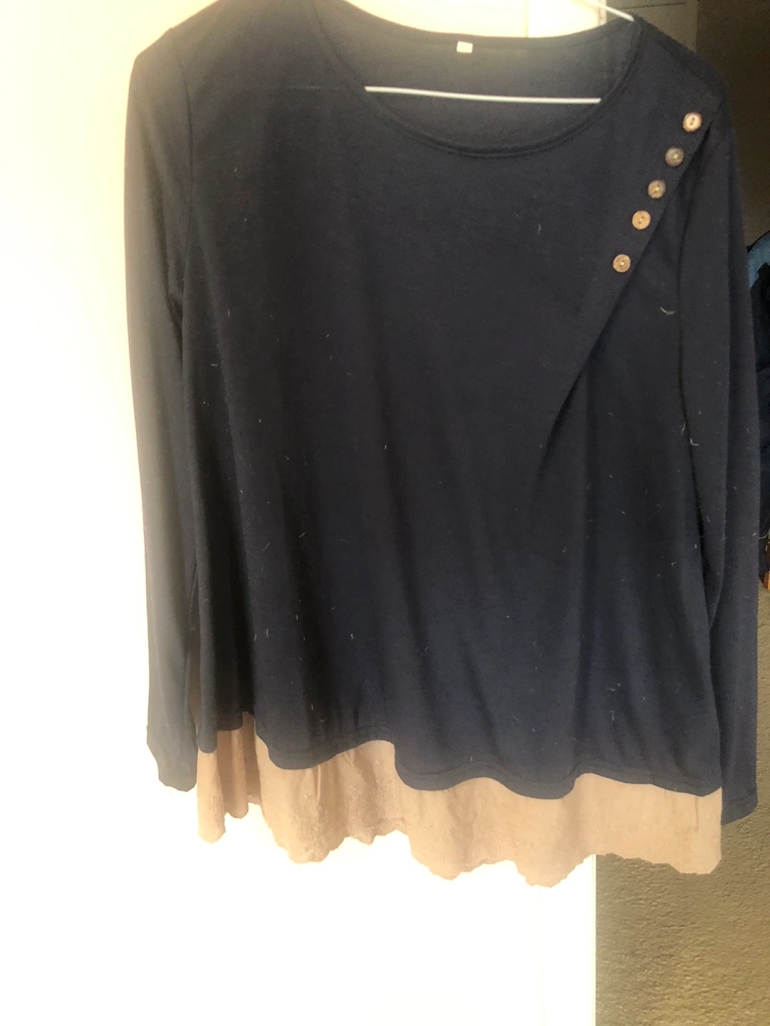 Long sleeve tunic top. Features a navy blue top with beige Lace bottom. Button detail on the shoulder. Relaxed fit.