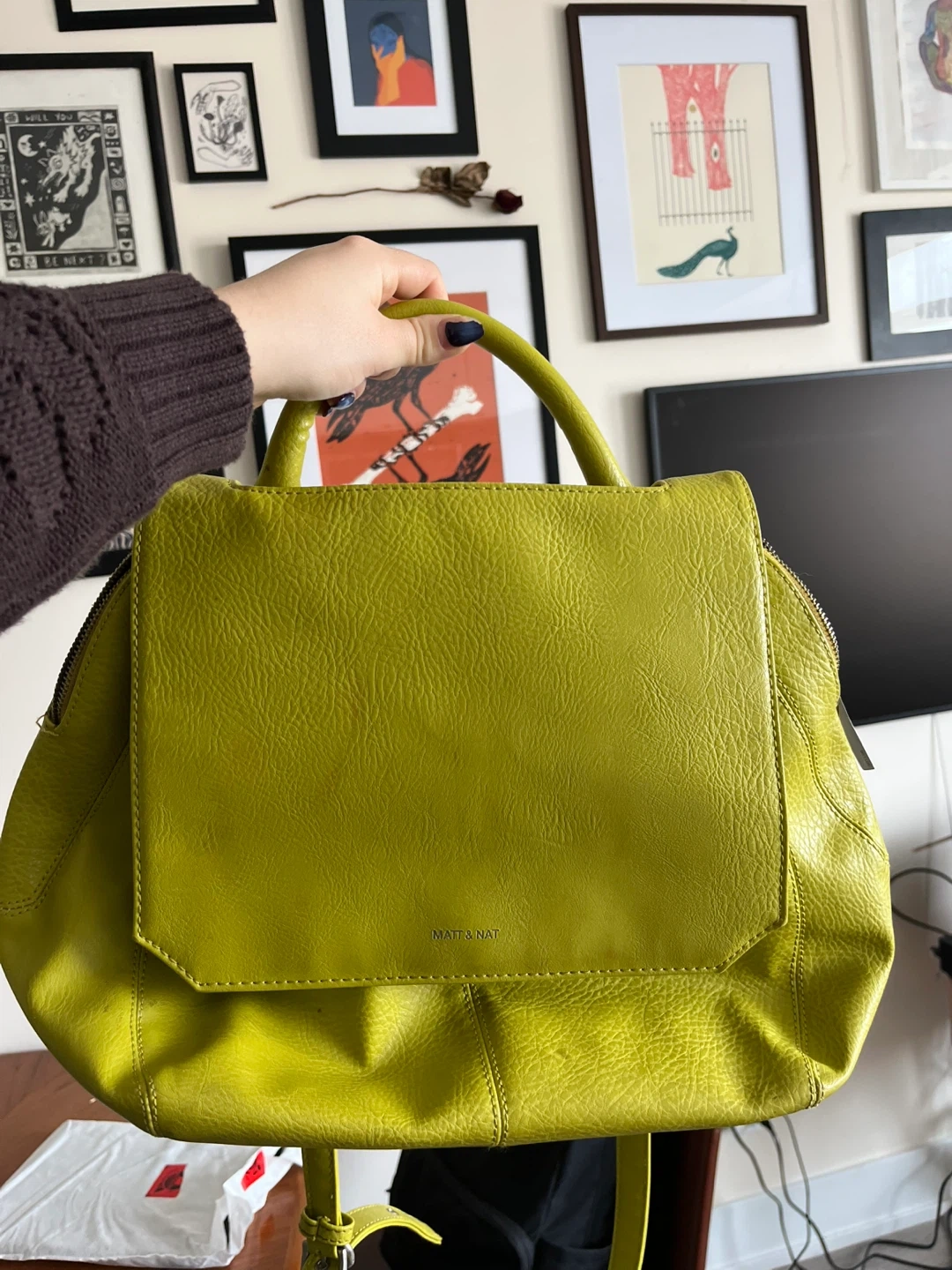 This is a green faux leather handbag by Matt & Nat. It's a stylish accessory for everyday use. The bag has a textured finish and a fold-over flap closure.