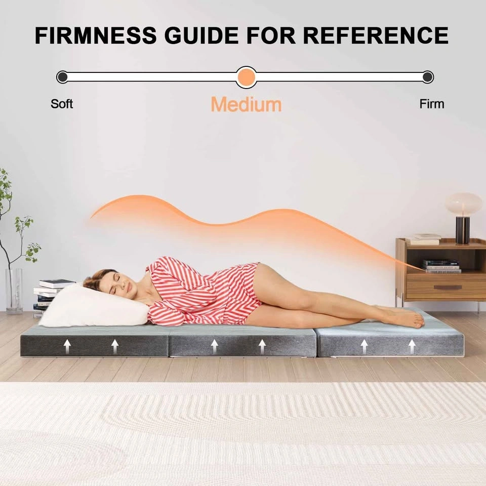 This Twolike Queen size tri-fold mattress features a medium firmness and a comfortable fabric cover. It's constructed with two layers, including a 5-inch high-density support foam for full body support and a cooling memory foam layer to relieve stress. The non-slip bottom keeps it in place. It's lightweight, easy to fold, carry, and store, making it great for home, travel, camping, or in campers and tents. Made with safe, harmless materials for peace of mind.
