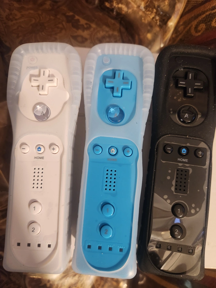 Selling three Nintendo Wii remotes in good condition! Colors include white, blue, and black. Great for family game night or replacing lost controllers