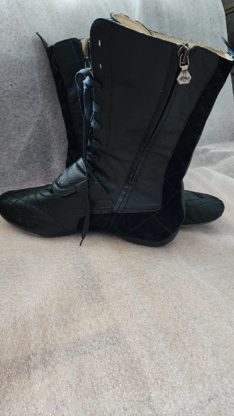 Bottes montantes Adidas noires, en cuir et suède. Fermeture par lacets et zip latéral. Pointure 10 US / 44 EU. Parfaites pour un look audacieux.
