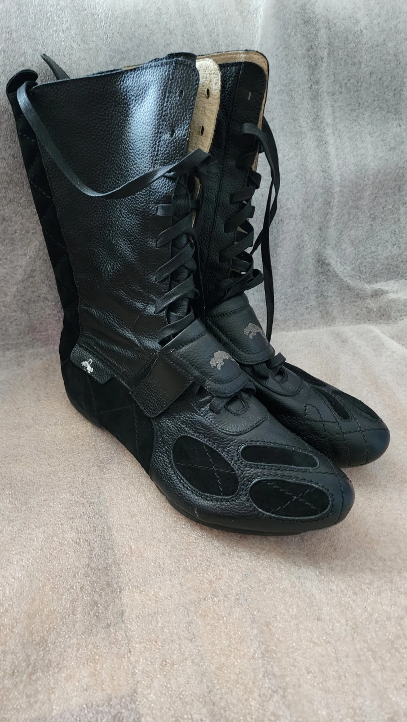 Bottes montantes Adidas noires, en cuir et suède. Fermeture par lacets et zip latéral. Pointure 10 US / 44 EU. Parfaites pour un look audacieux.