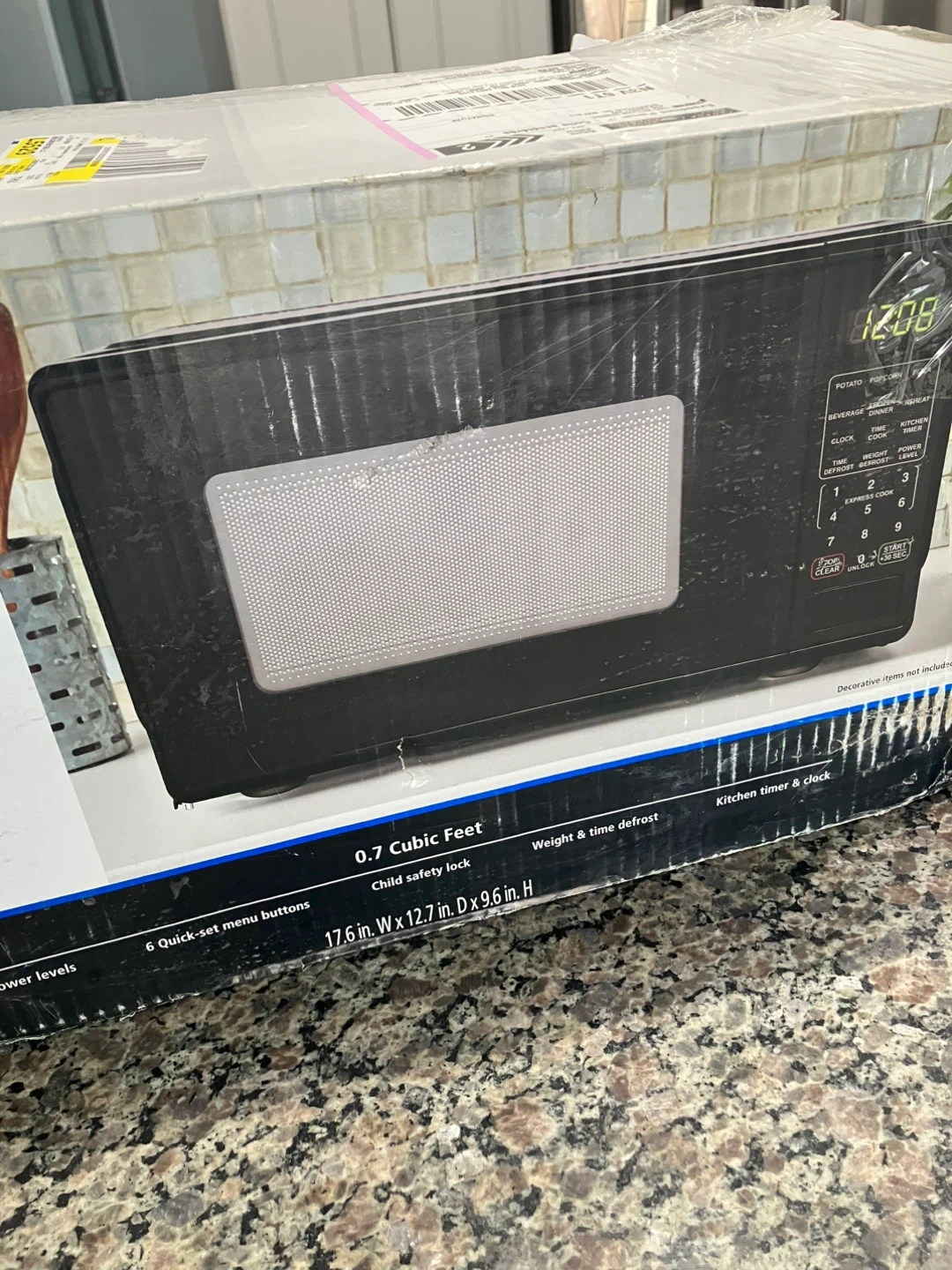 This is a black countertop microwave with 0.7 cubic feet of capacity. It features a child safety lock, weight and time defrost, and a kitchen timer with a clock. The dimensions are 17.6 in. W x 12.7 in. D x 9.6 in. H. Includes 6 Quick-set menu buttons.