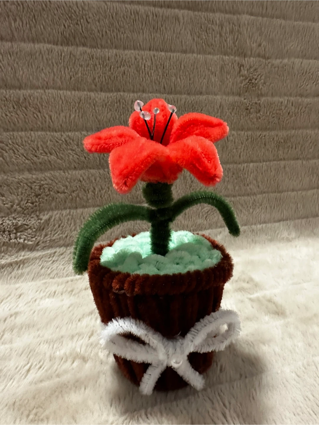 A cute handmade flower made from pipe cleaners and placed in a decorative pot. The flower is red with green leaves and stem, and the pot is brown with a white ribbon tied around it. It's a small decorative piece that adds a touch of colour to any space.