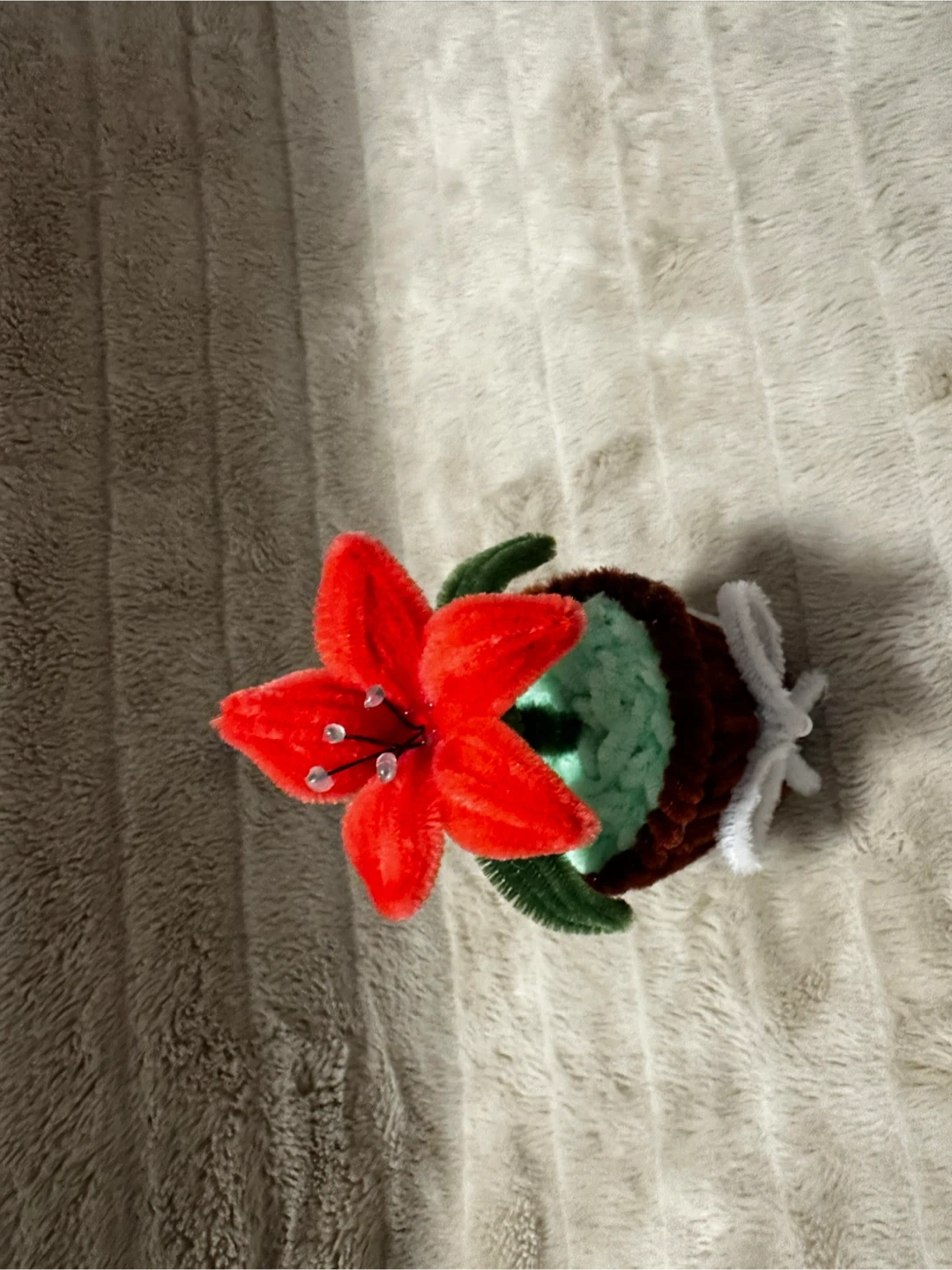 A cute handmade flower made from pipe cleaners and placed in a decorative pot. The flower is red with green leaves and stem, and the pot is brown with a white ribbon tied around it. It's a small decorative piece that adds a touch of colour to any space.