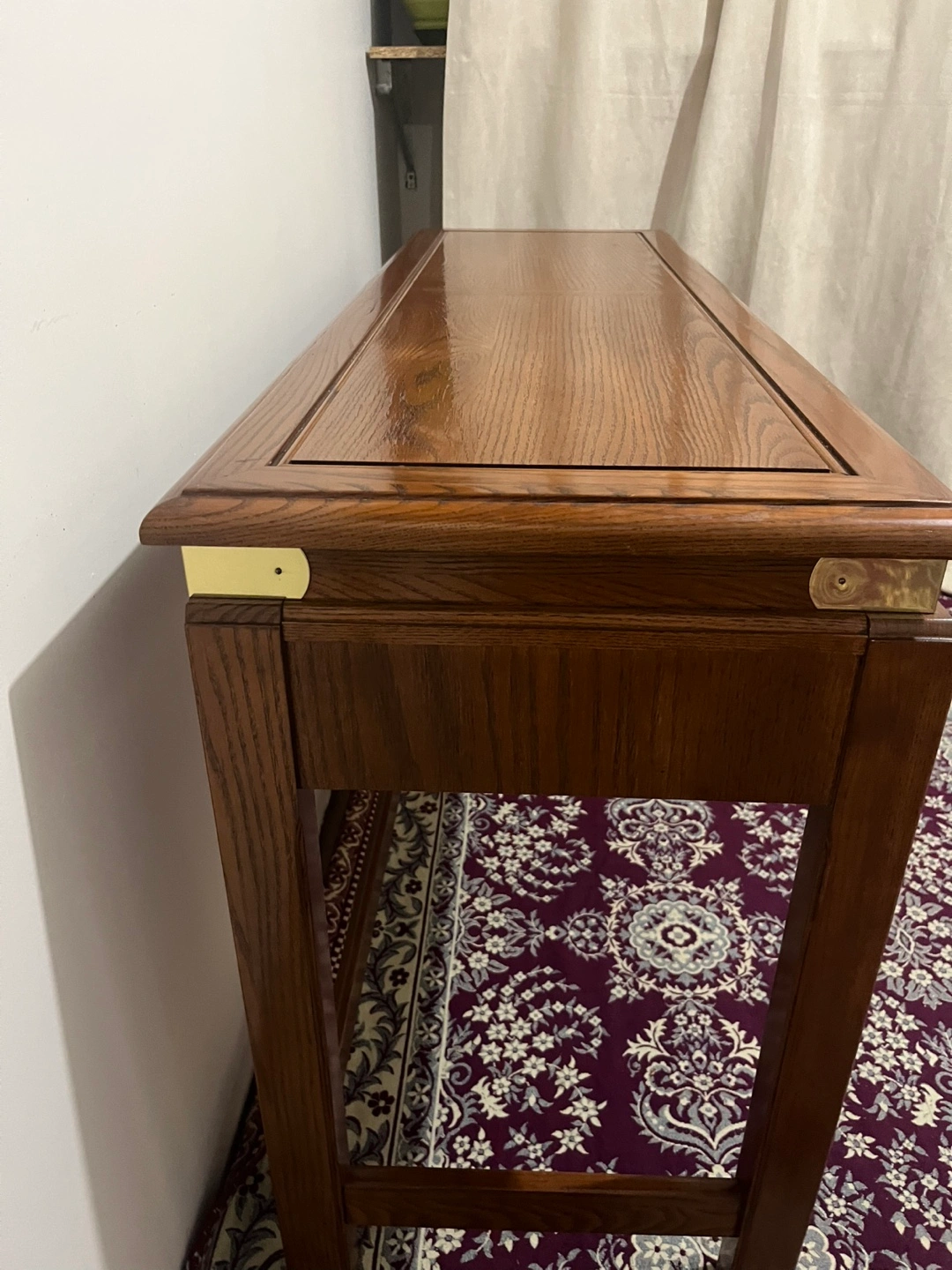 Solid wood console table with a single drawer. Brass hardware and a dark wood finish.made in Canada
