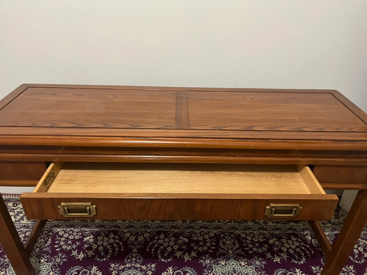 Solid wood console table with a single drawer. Brass hardware and a dark wood finish.made in Canada