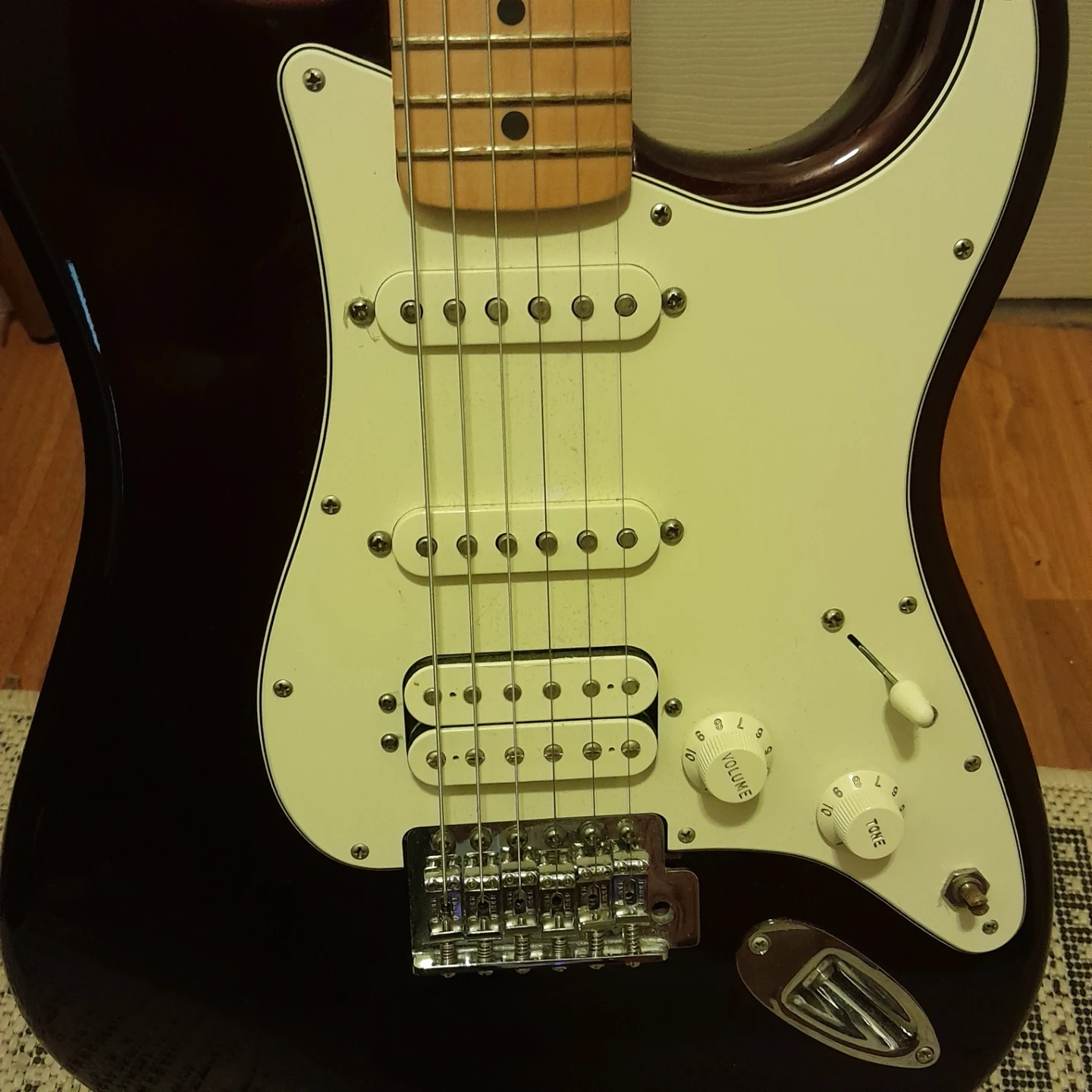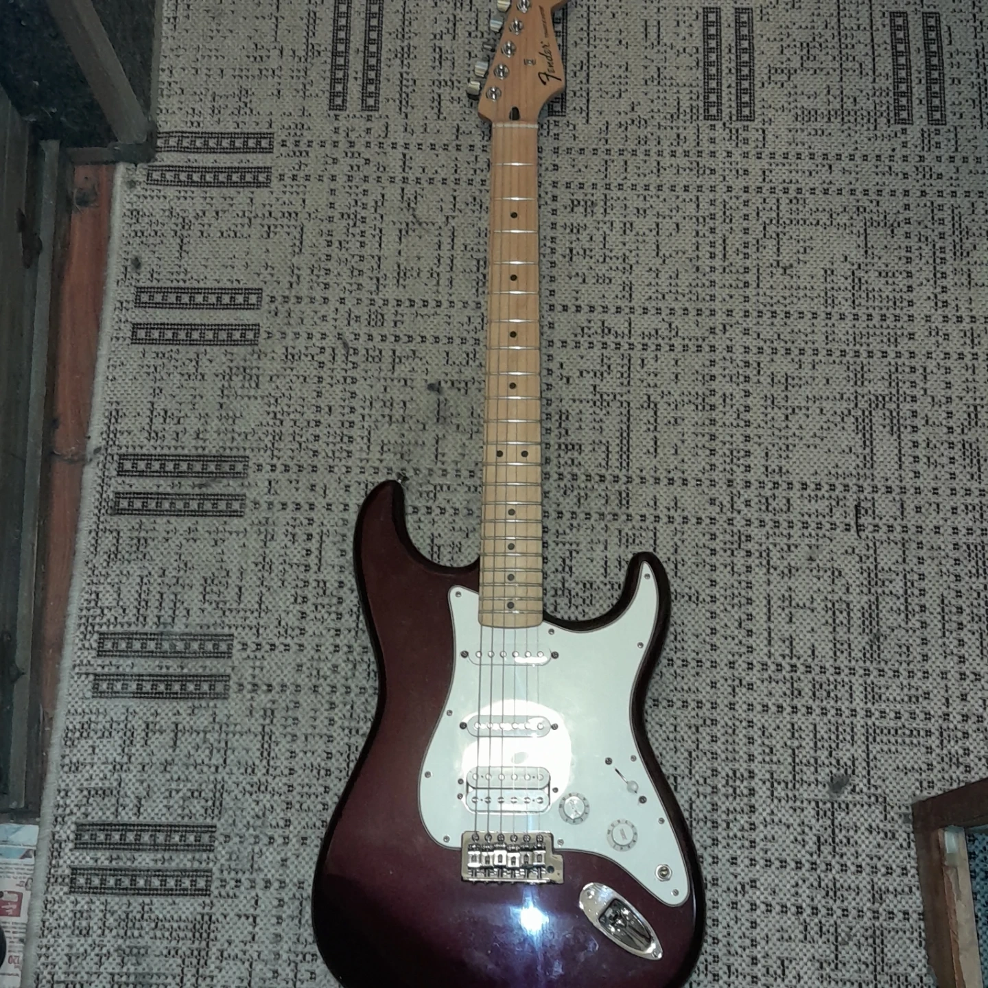 Fender Stratocaster electric Mexican guitar deep burgundy , maple neck, three single-coil pickups and gig bag. Barely used recently set-up st long and mcquade. Priced for quick sale.