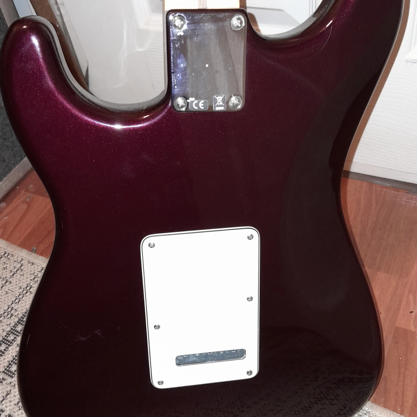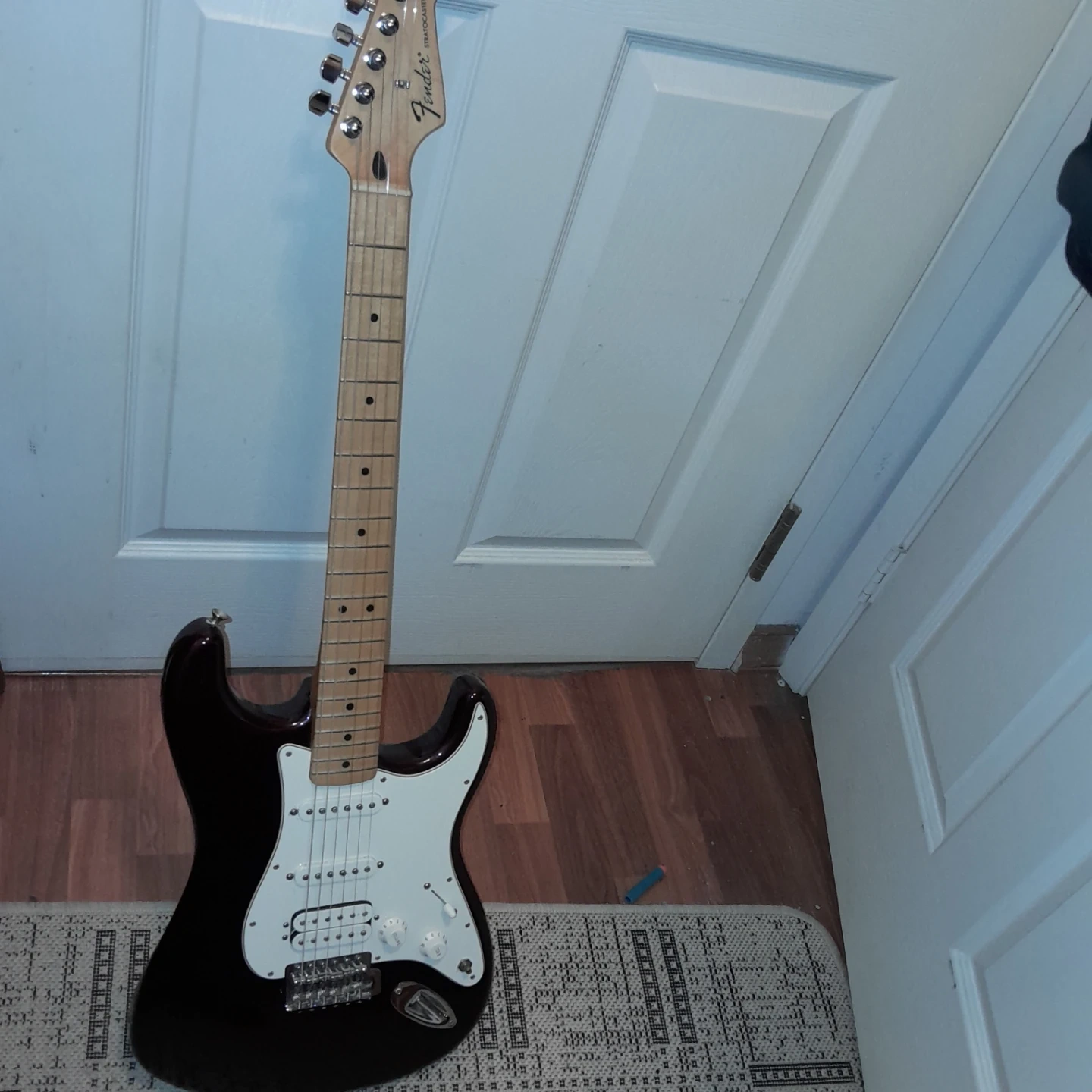 Fender Stratocaster electric Mexican guitar deep burgundy , maple neck, three single-coil pickups and gig bag. Barely used recently set-up st long and mcquade. Priced for quick sale.