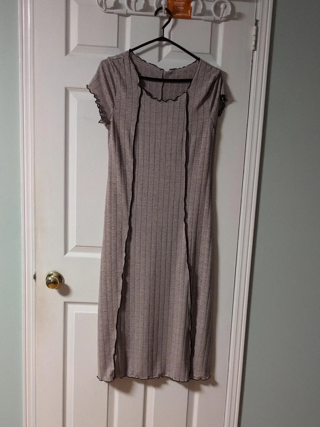 This is a ribbed knit midi dress. It features a square neckline and short sleeves with lettuce trim edges. The dress has a seam down the centre front and back for a fitted silhouette. It's made of a comfortable stretch fabric.