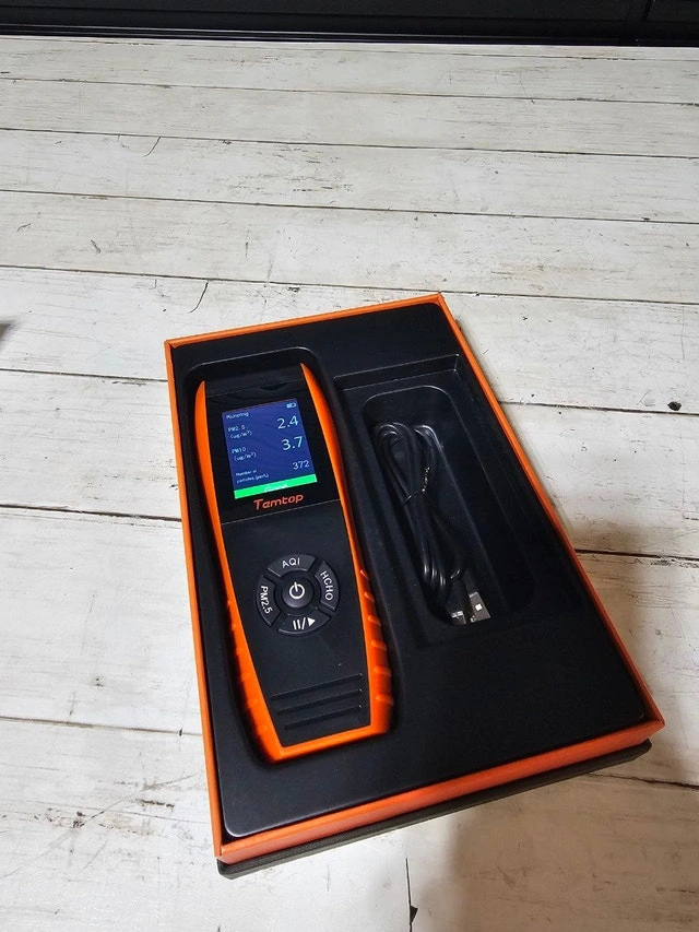 This is a new Temtop LKC1000S+ indoor air quality monitor. It measures PM2.5, PM10, formaldehyde (HCHO), and tVOCs. It also monitors temperature and humidity, and displays an AQI reading. The device features a large TFT screen for easy reading, a 6-level color health indicator, and data export capabilities with a histogram function for PM2.5 tracking over the last 12 hours. It can store at least 3 months of data. The industrial-grade laser particle sensor has a long lifespan of up to 20,000 hours. Please note, this model does not detect CO, CO2, allergens, mold, or radon. For sale by owner.