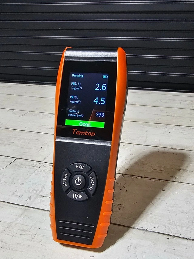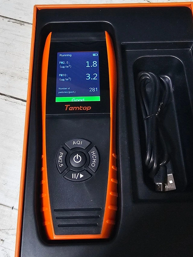 This is a new Temtop LKC1000S+ indoor air quality monitor. It measures PM2.5, PM10, formaldehyde (HCHO), and tVOCs. It also monitors temperature and humidity, and displays an AQI reading. The device features a large TFT screen for easy reading, a 6-level color health indicator, and data export capabilities with a histogram function for PM2.5 tracking over the last 12 hours. It can store at least 3 months of data. The industrial-grade laser particle sensor has a long lifespan of up to 20,000 hours. Please note, this model does not detect CO, CO2, allergens, mold, or radon. For sale by owner.