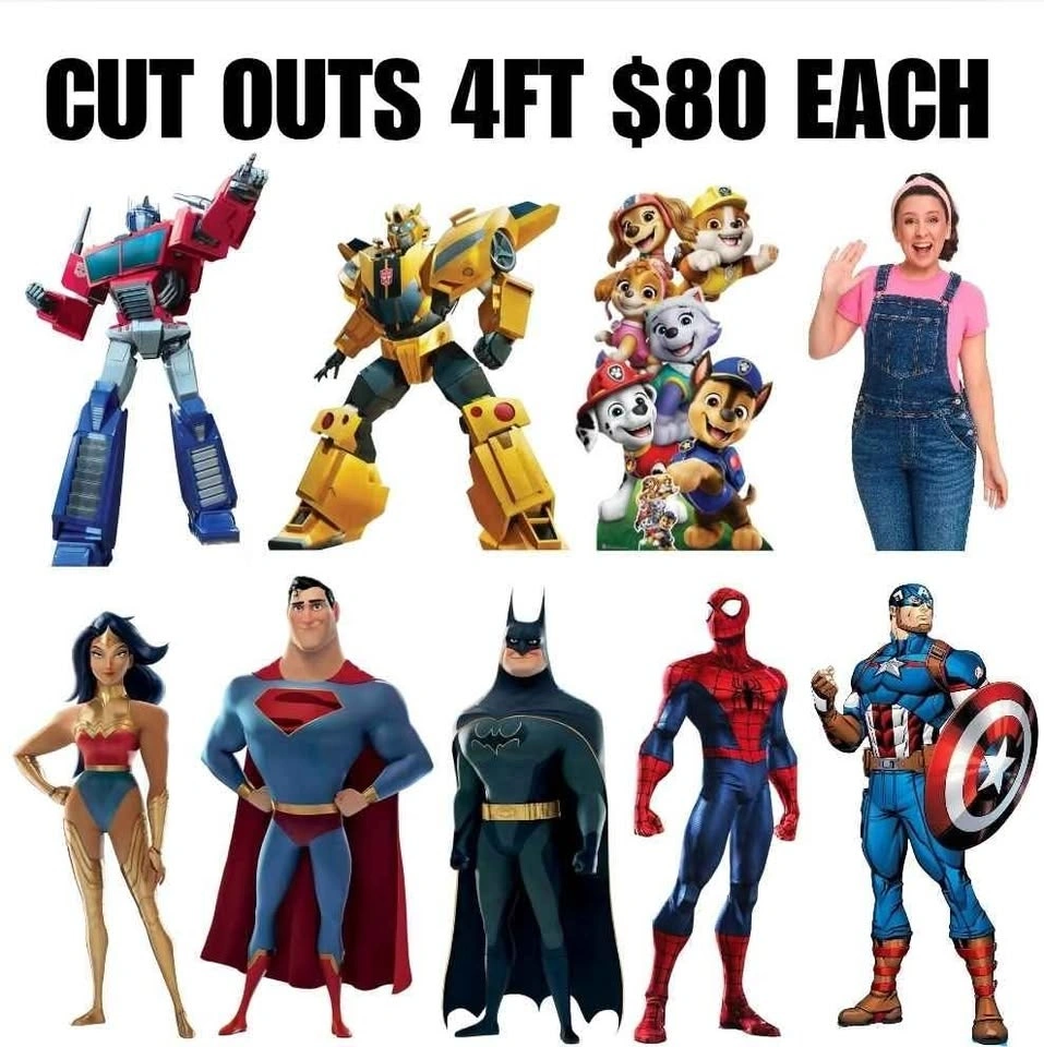 Grab our ready-to-pickup cut-out designs or let us bring your vision to life with fully custom creations! Perfect for parties, events, or business displays. We also offer all types of signage and printing – from business branding to birthday décor! Local Pickup Available. Message us to order or get a quote!
