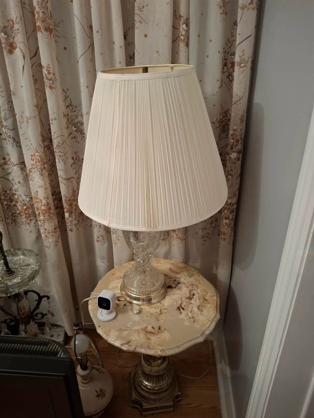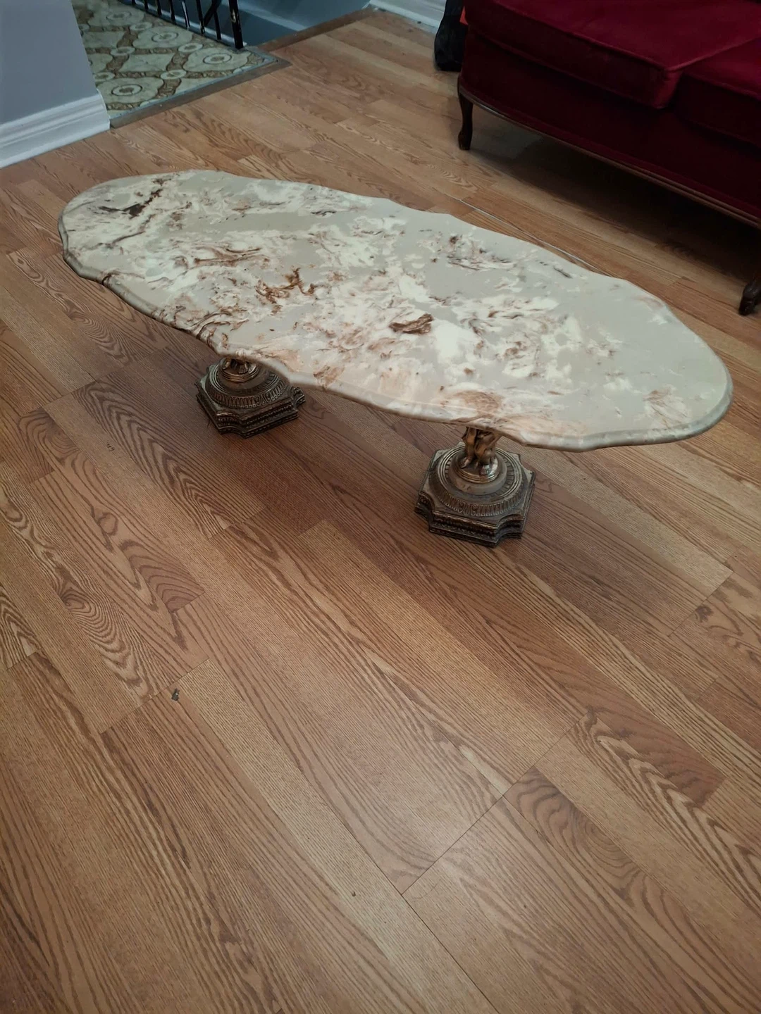 Unique oval-shaped coffee table featuring a marble-look top with brown veining. It's supported by two decorative ornate bases. This coffee table comes with the side two tables and lamps. This statement piece adds a touch of vintage elegance to any living space.