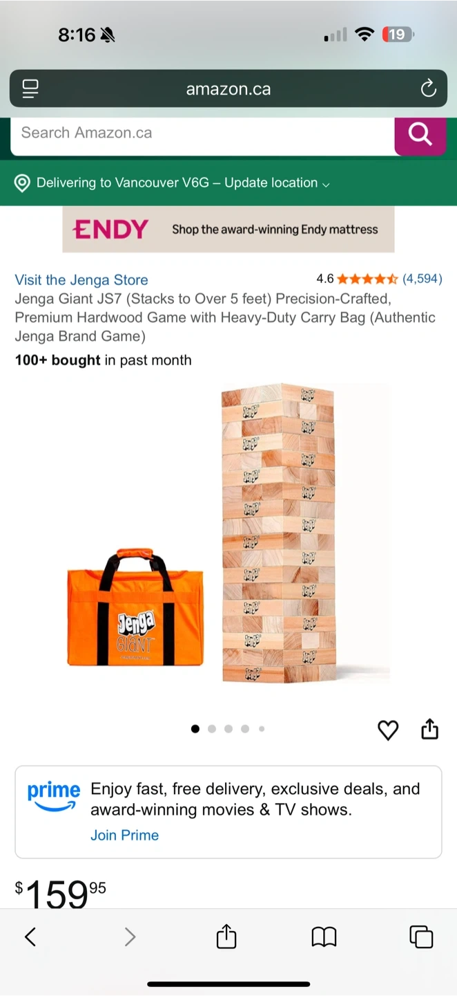 Selling a Jenga Giant JS7 hardwood game! It comes with a heavy-duty carry bag for easy transport. This game stacks to over 5 feet. Originally bought for $159.95