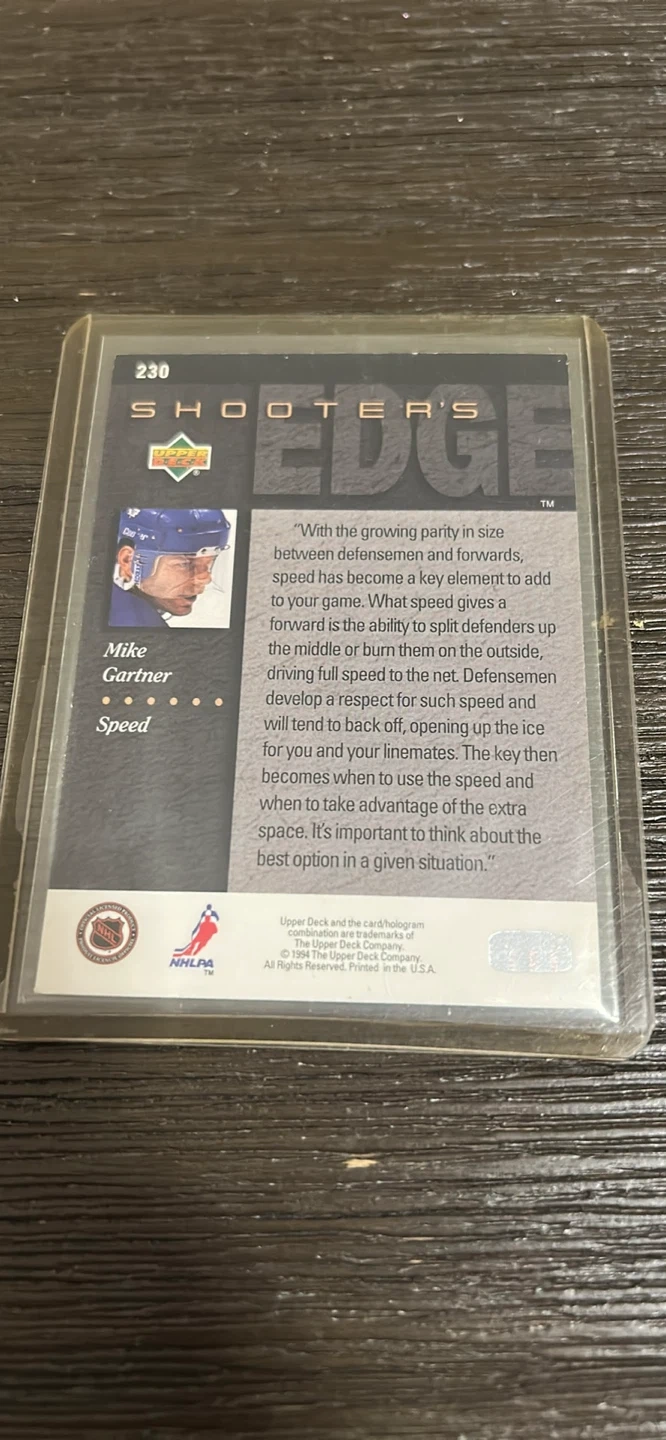This is a signed Mike Gartner hockey card from Upper Deck's Shooters Edge collection. It features a 1990s design. The card details his skills and playstyle. A great collectible for any hockey fan!
