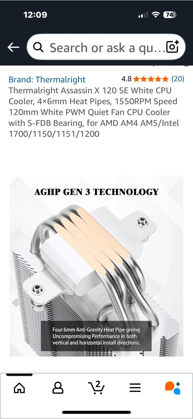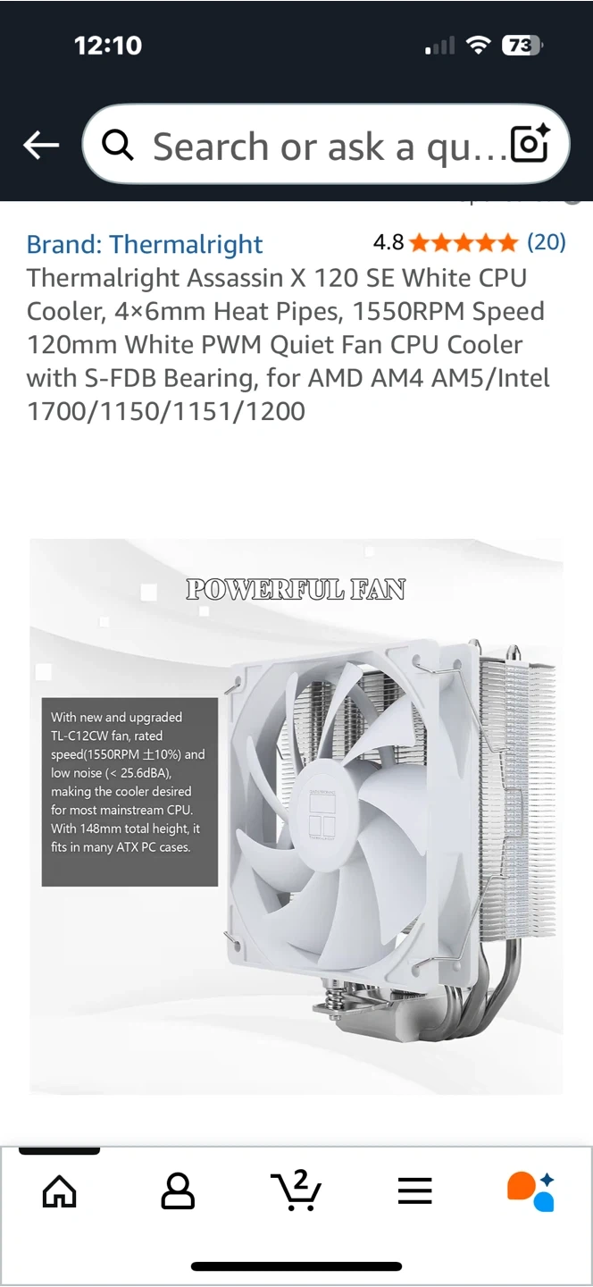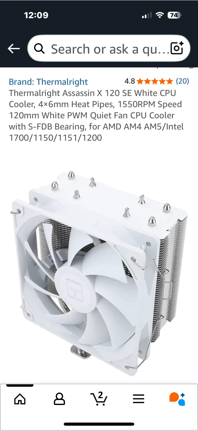 Selling a Thermalright Assassin X 120 SE White CPU Cooler. It features 4x6mm heat pipes and a 120mm white PWM quiet fan. Designed with S-FDB Bearing, compatible with AMD AM4 AM5/Intel 1700/1150/1151/1200 sockets. It's a powerful fan with AGHP GEN 3 technology for anti-gravity performance and fast heat dissipation! Perfect match for designed RAM compatibility